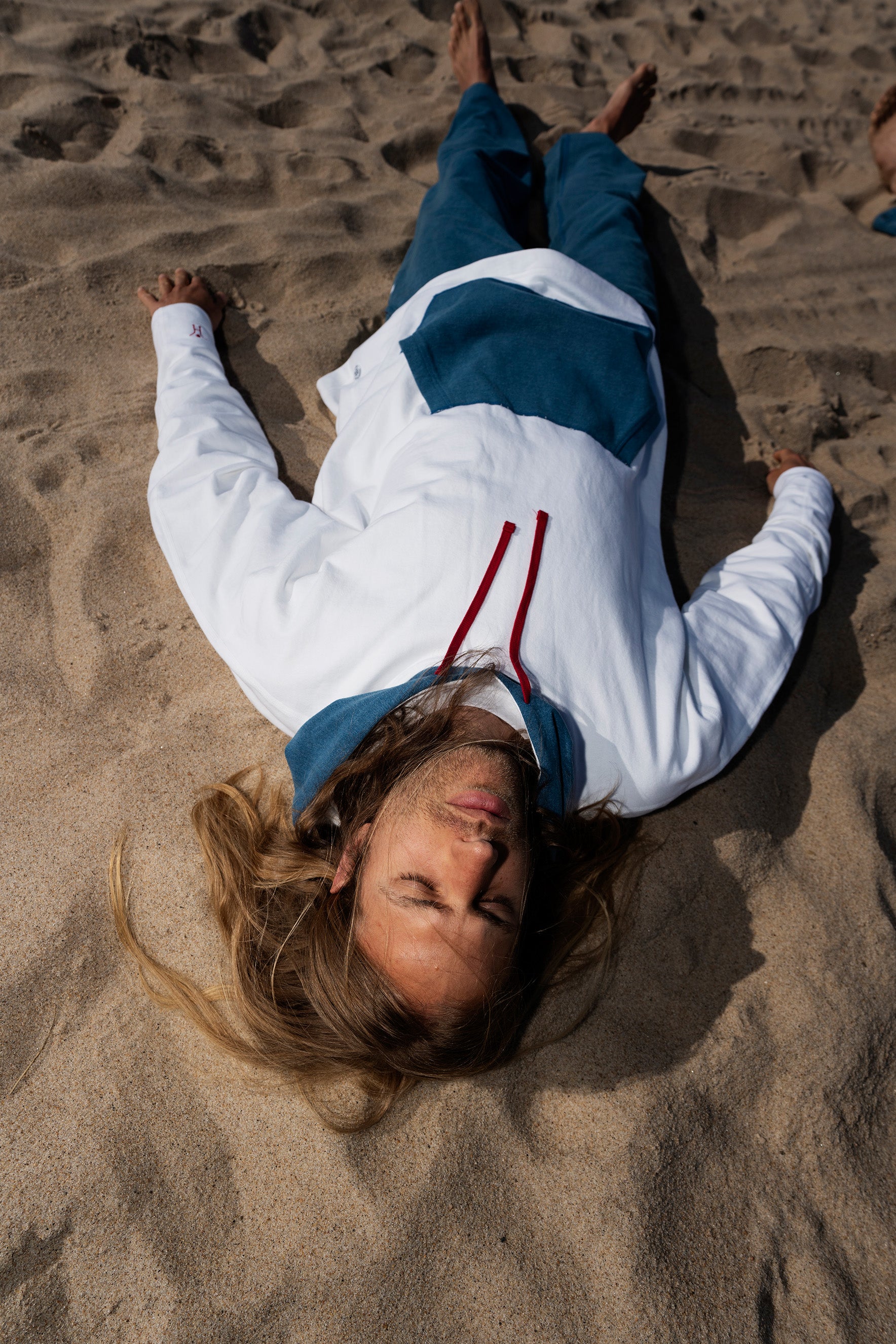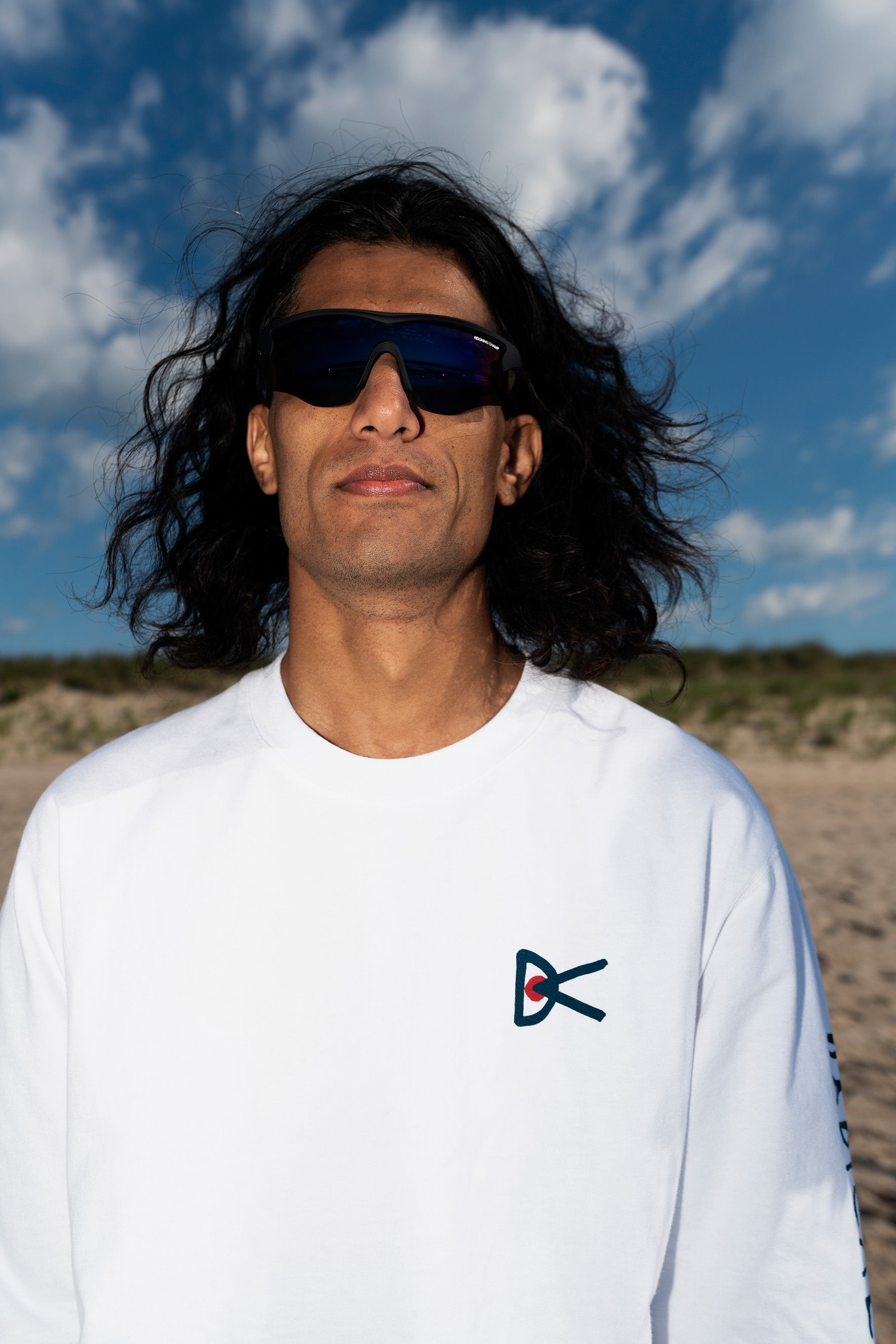 An exclusive Junya Racer sunglass with a custom Radical Retreat™ lens is paired with loose-fitting tops and bottoms featuring artwork by Filip Pagowski. White and indigo-dyed fabrics are intentionally combined to encourage colour bleeding, and all indigo garments will develop a unique appearance with wear and washing.
