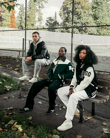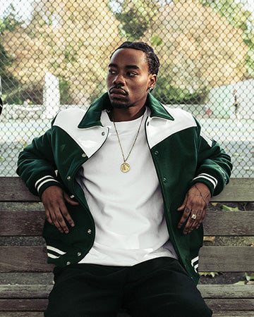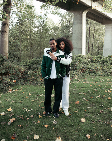 We collaborated on a custom series of varsity jackets, cut and sewn at their San Francisco factory, melding 100-year-old manufacturing expertise with contemporary styling and archival design details. Originated in the 60’s, the Albany Jacket is a familiar silhouette that we reproduced in two versions, each with a monochromatic palette adorned with classic graphic appliqué. The Lobos Jacket is our nod to a less prevalent varsity style, featuring a vintage forest green base with a western-style shoulder yoke in white cowhide leather.