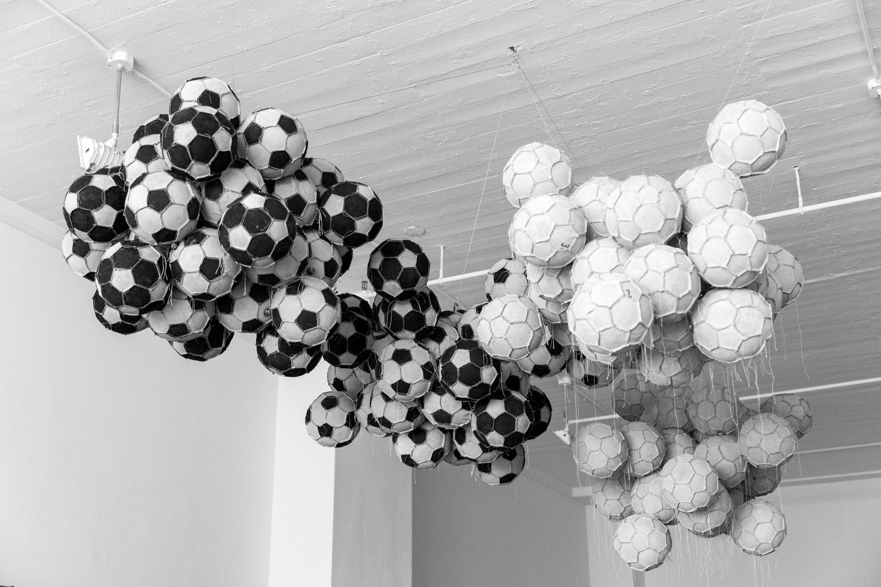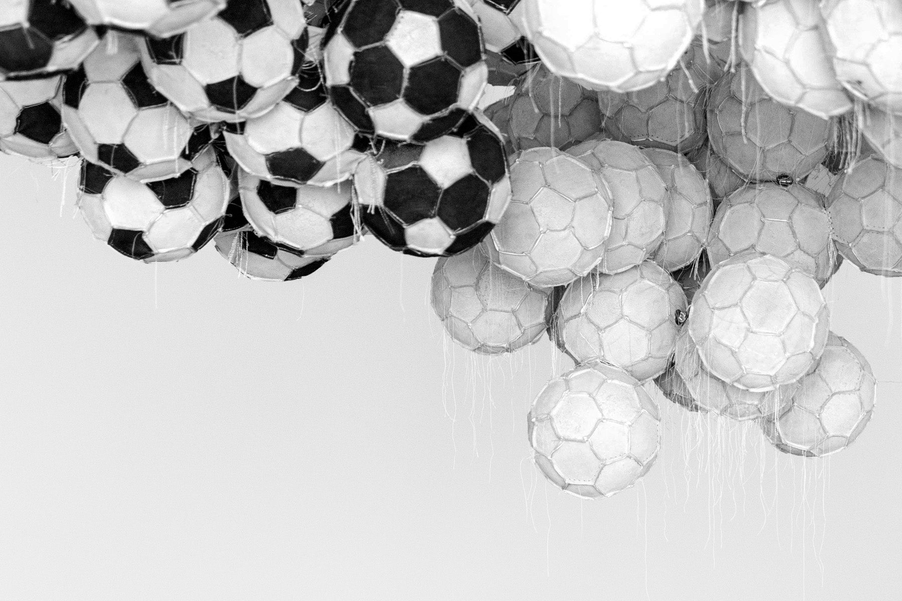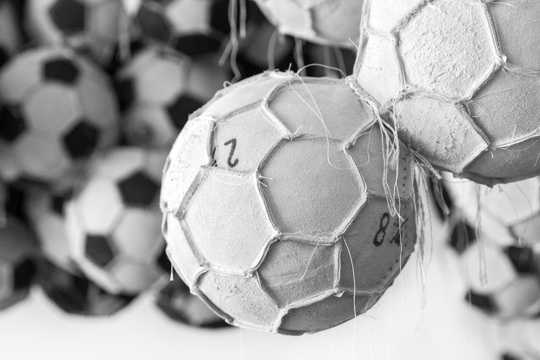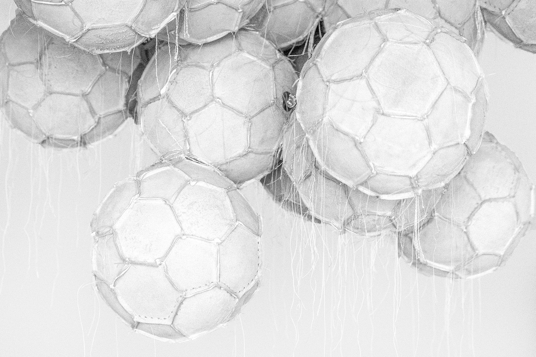 The threads exist inside the balls themselves, they are a space of movement that is free of control, the truth is that they are part of the history of the soccer ball, are symptoms of their own imperfection, which I find fascinating because now that they are exposed they are like a drawing in constant movement.