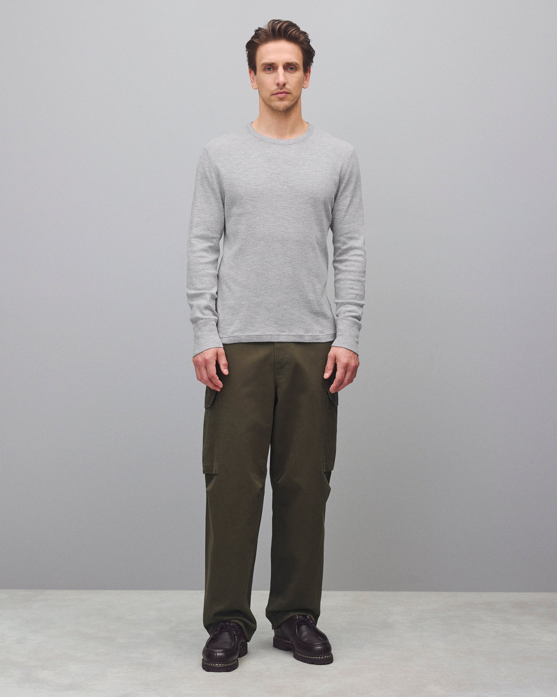 This slim-fit long sleeve, crafted from textured slub rib cotton, elevates casual wear with its distinctive look and feel. Designed with a fine rib-bound collar, signature flatlock seams, a flat hem, and rear shoulder yoke for added durability and structure.