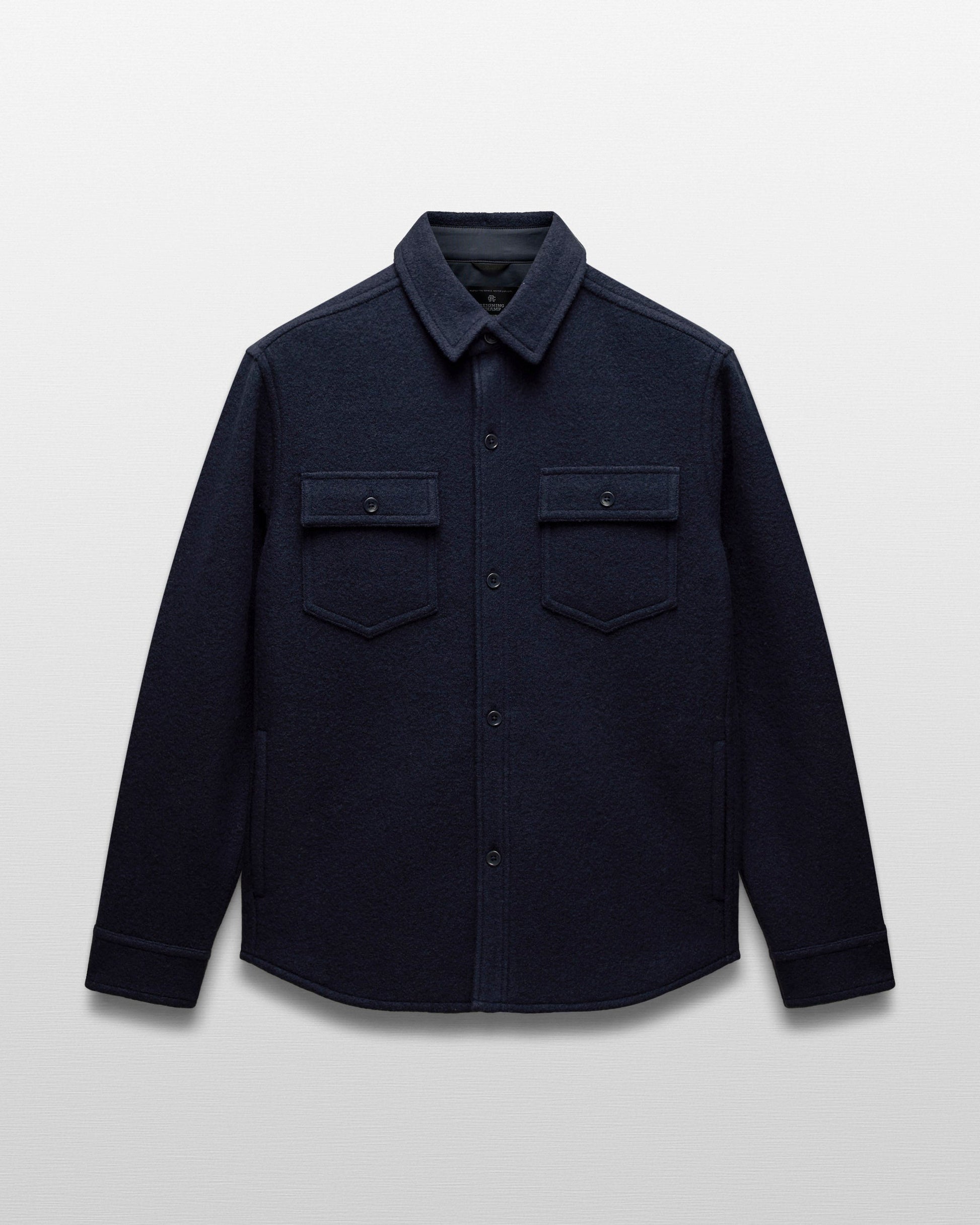 This classic overshirt is crafted from boiled merino wool with a dense, hairy texture. Featuring a standard fit, with full-cut sleeves and torso to provide versatility for layering. Designed with a pointed collar, flap chest pockets, corozo logo buttons, on-seam side pockets, adjustable cuffs, and a scooped hem.