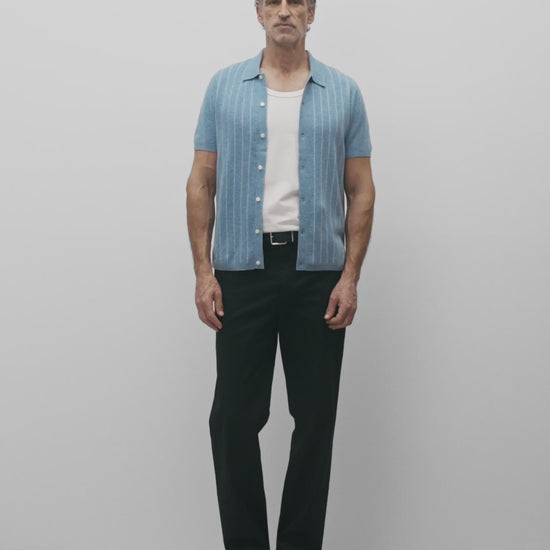 This short sleeve knit shirt is crafted from a breathable cotton-linen blend with the softest touch. Featuring a standard fit with fully fashioned seams. Designed with a half-milano stitch collar and placket, tonal logo buttons, and lycra-bound cuffs and hem.