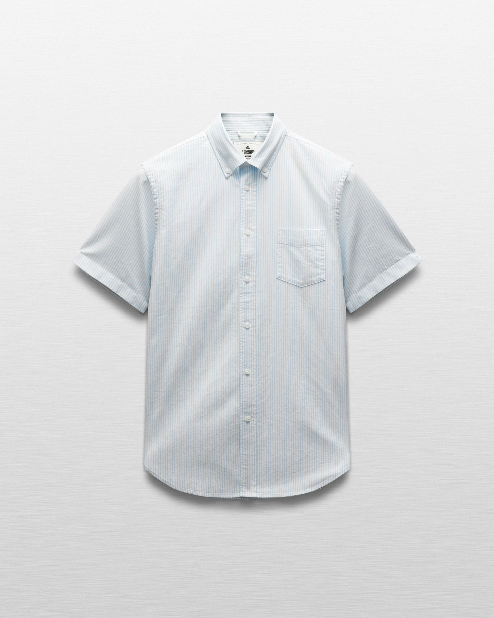 This buttondown short sleeve shirt is crafted from classic cotton oxford in a year-round weight. Featuring a standard fit, with full cut sleeves and torso. Designed with faux horn buttons, a chest pocket, and a curved hem. Finished with tonal monogram embroidery on the left sleeve cuff.
