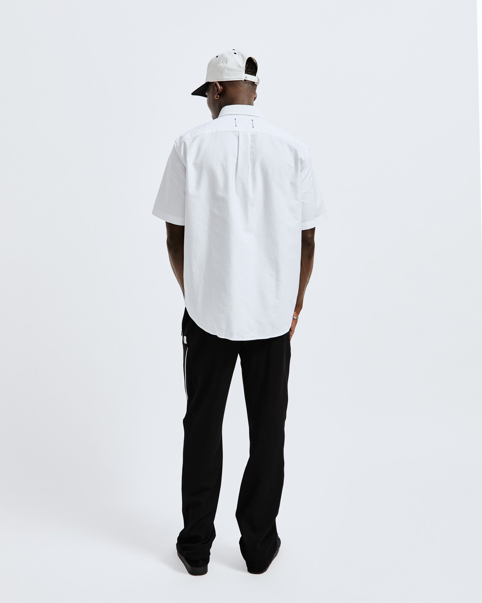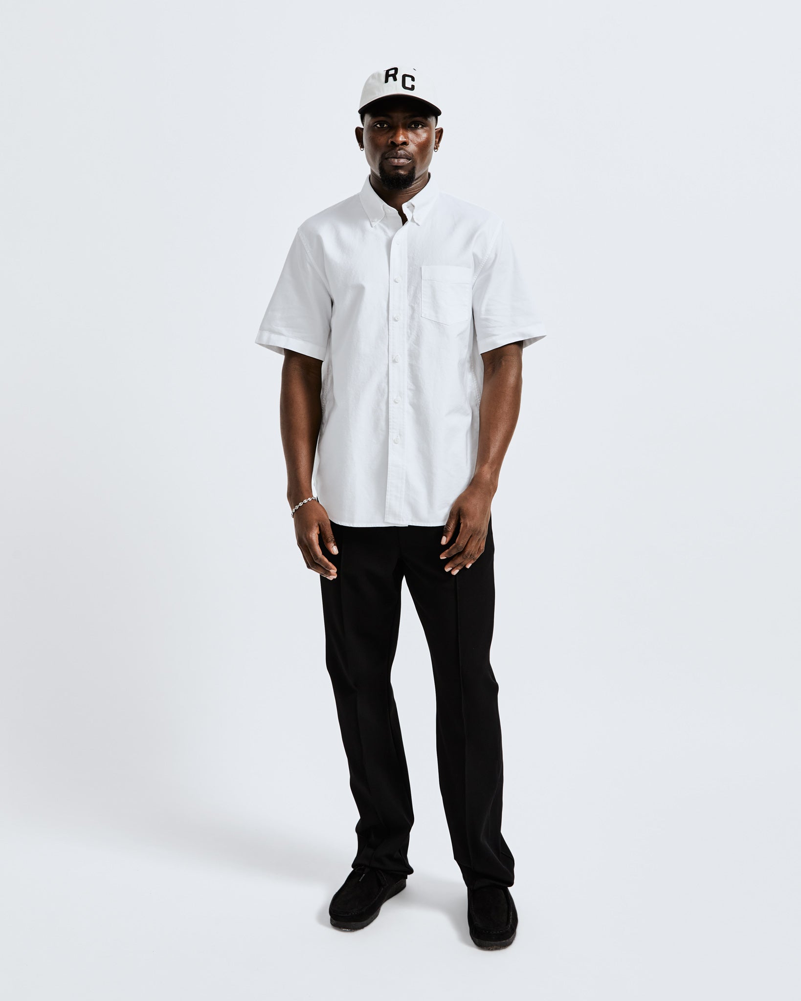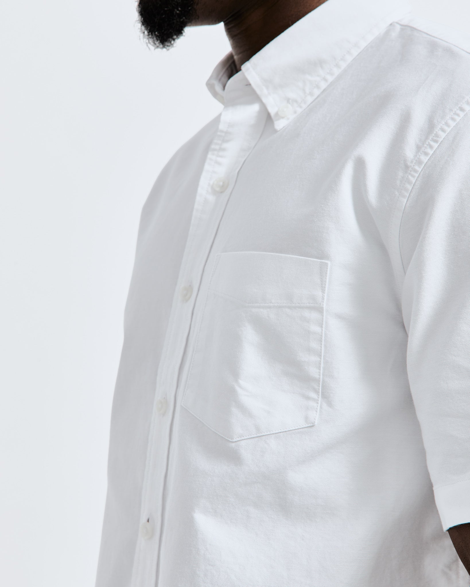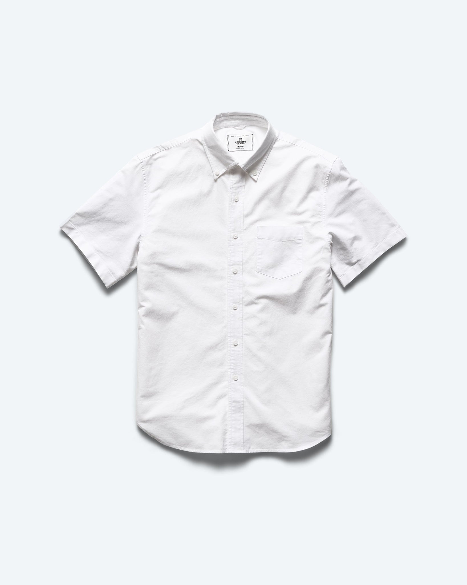 This short sleeve button-down shirt is crafted from classic cotton oxford in a year-round weight. Featuring a standard fit, with full cut sleeves and torso. Designed with faux horn buttons, a chest pocket, rear yoke with box pleat, and a curved hem.
