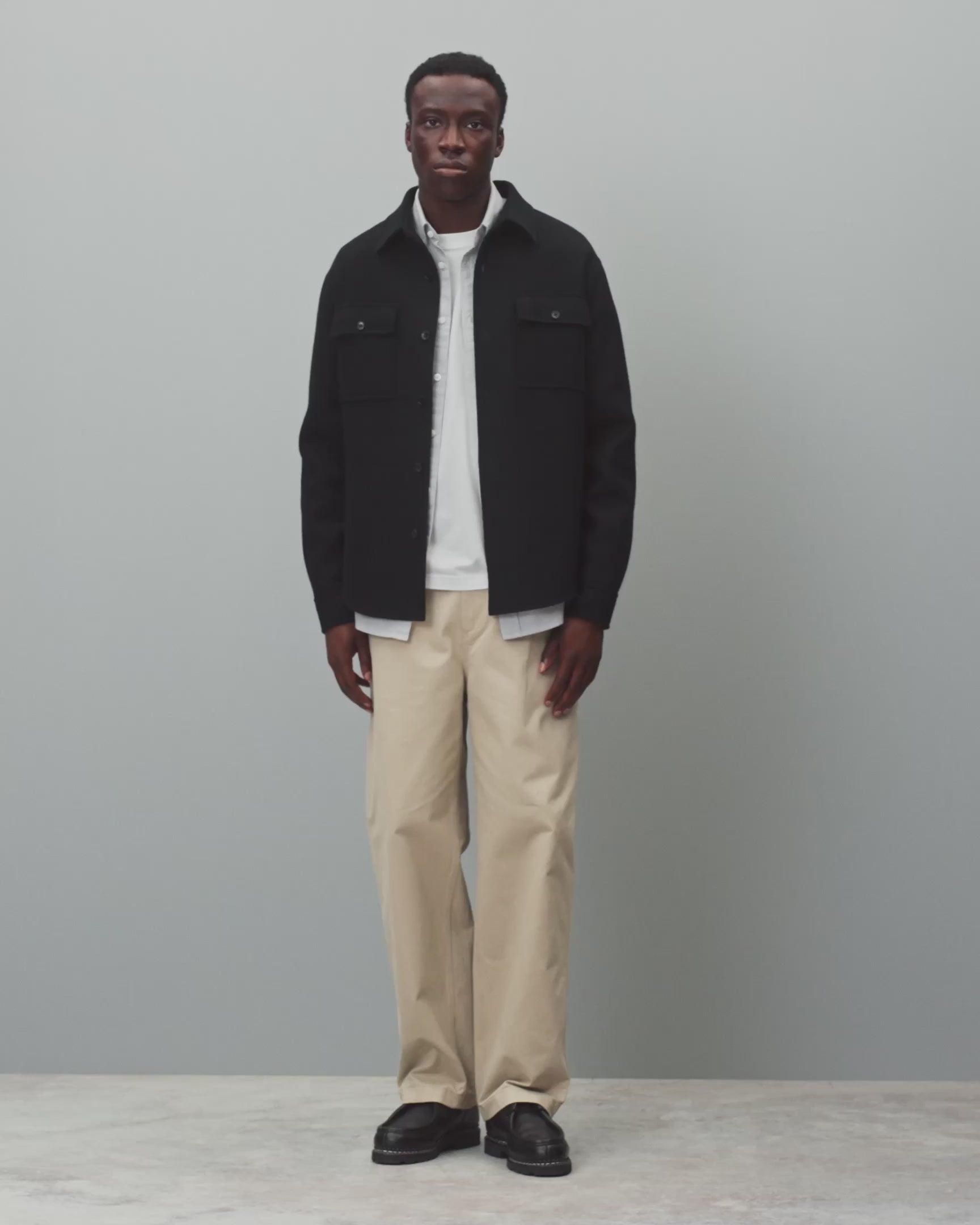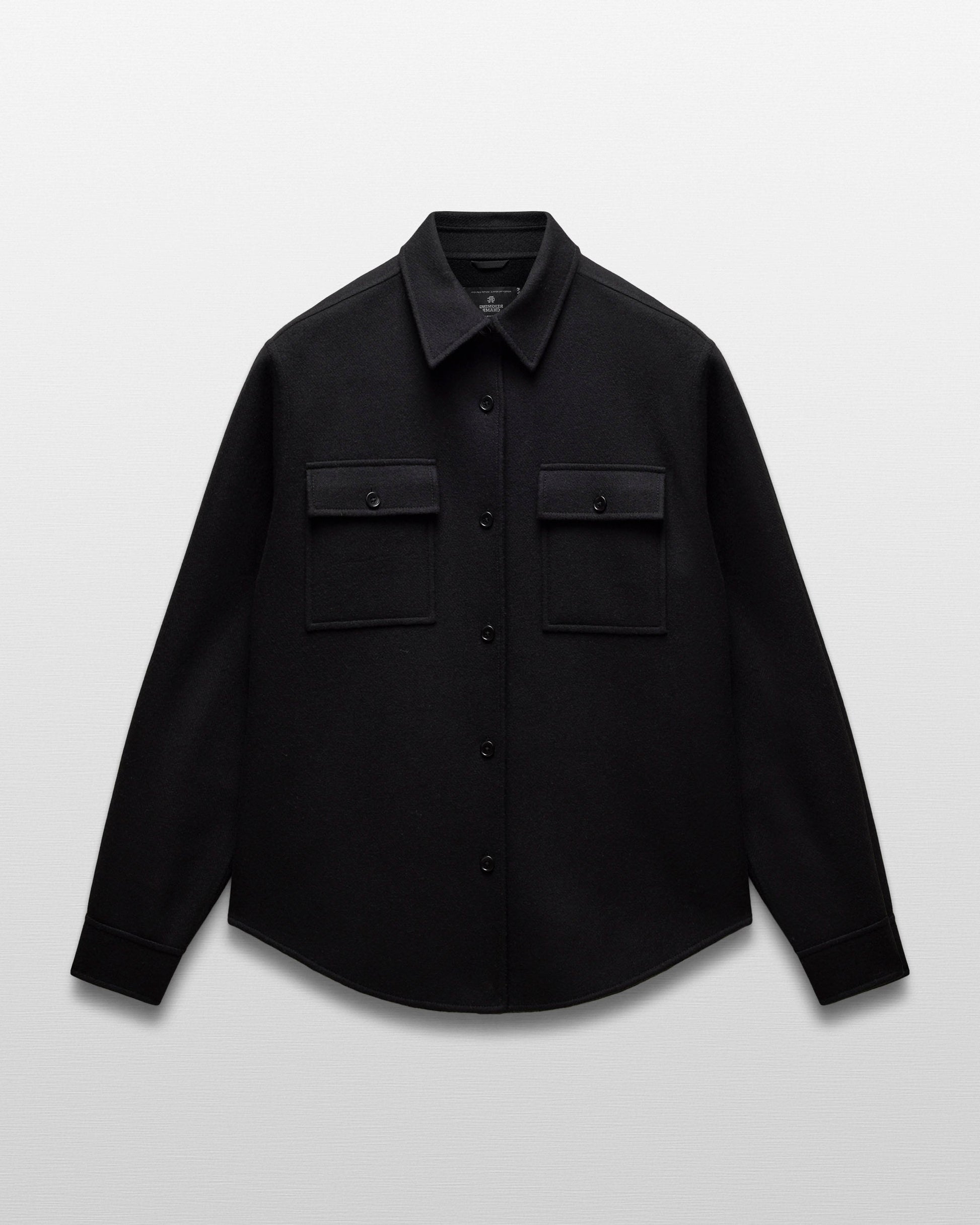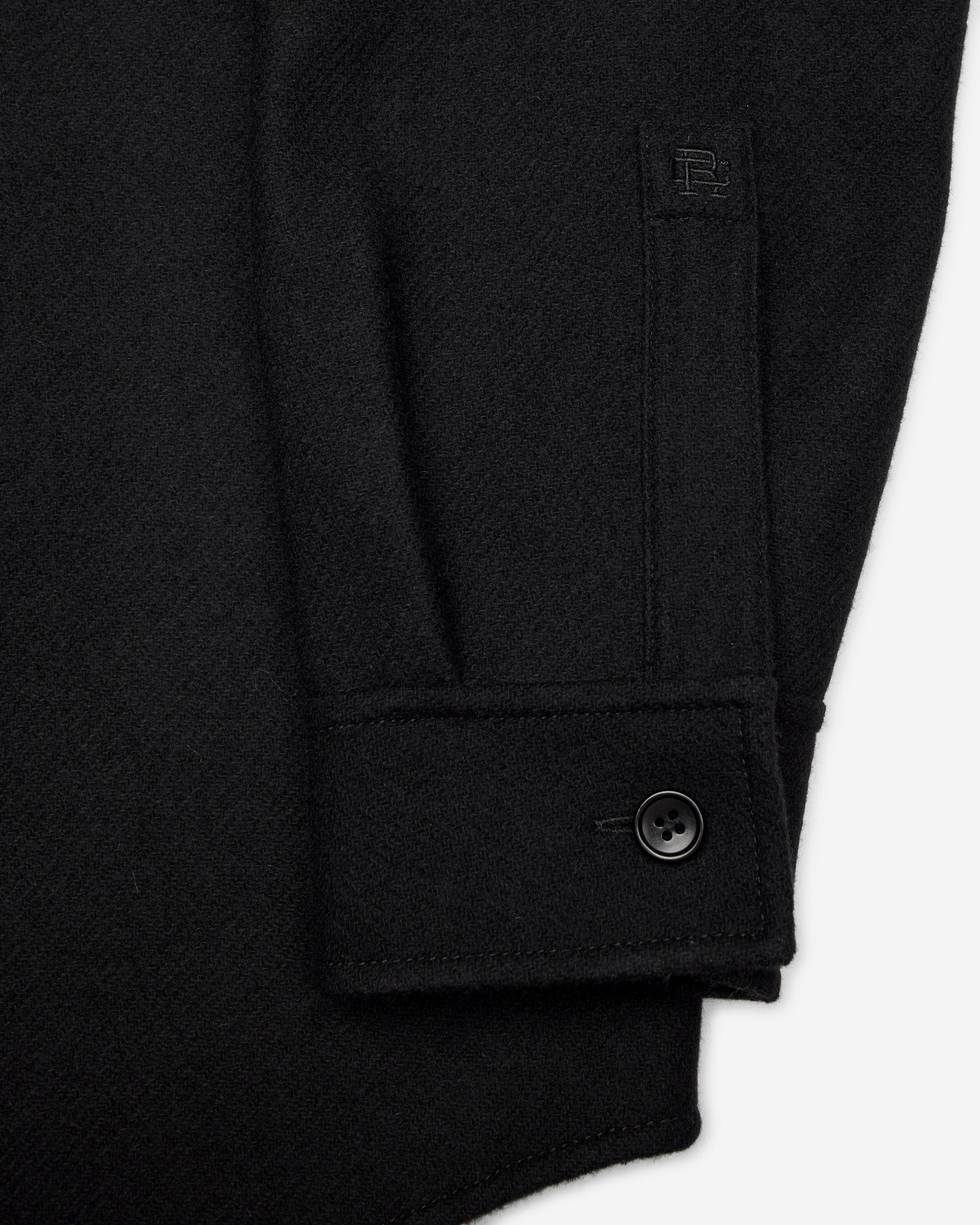Versatile for the cooler months, this overshirt is crafted from Italian virgin wool with a brushed, felted finish for added warmth. Cut in a standard fit for easy layering. Designed with a pointed collar, buttoned chest pockets, corozo buttons, a curved hem, and tonal monogram embroidery at the left cuff placket.