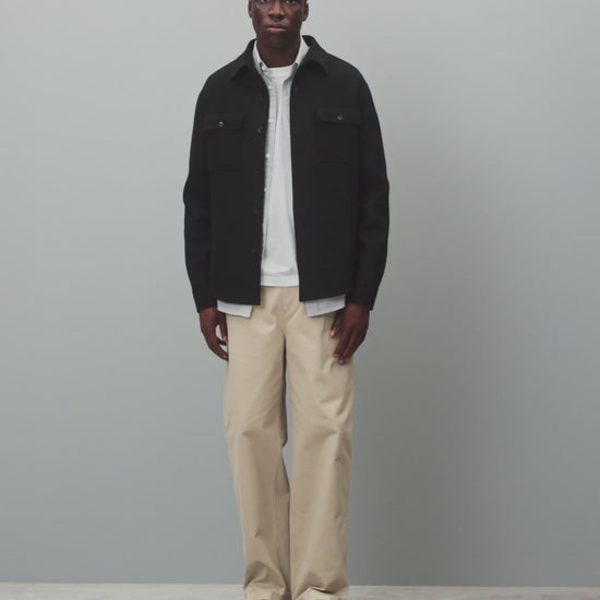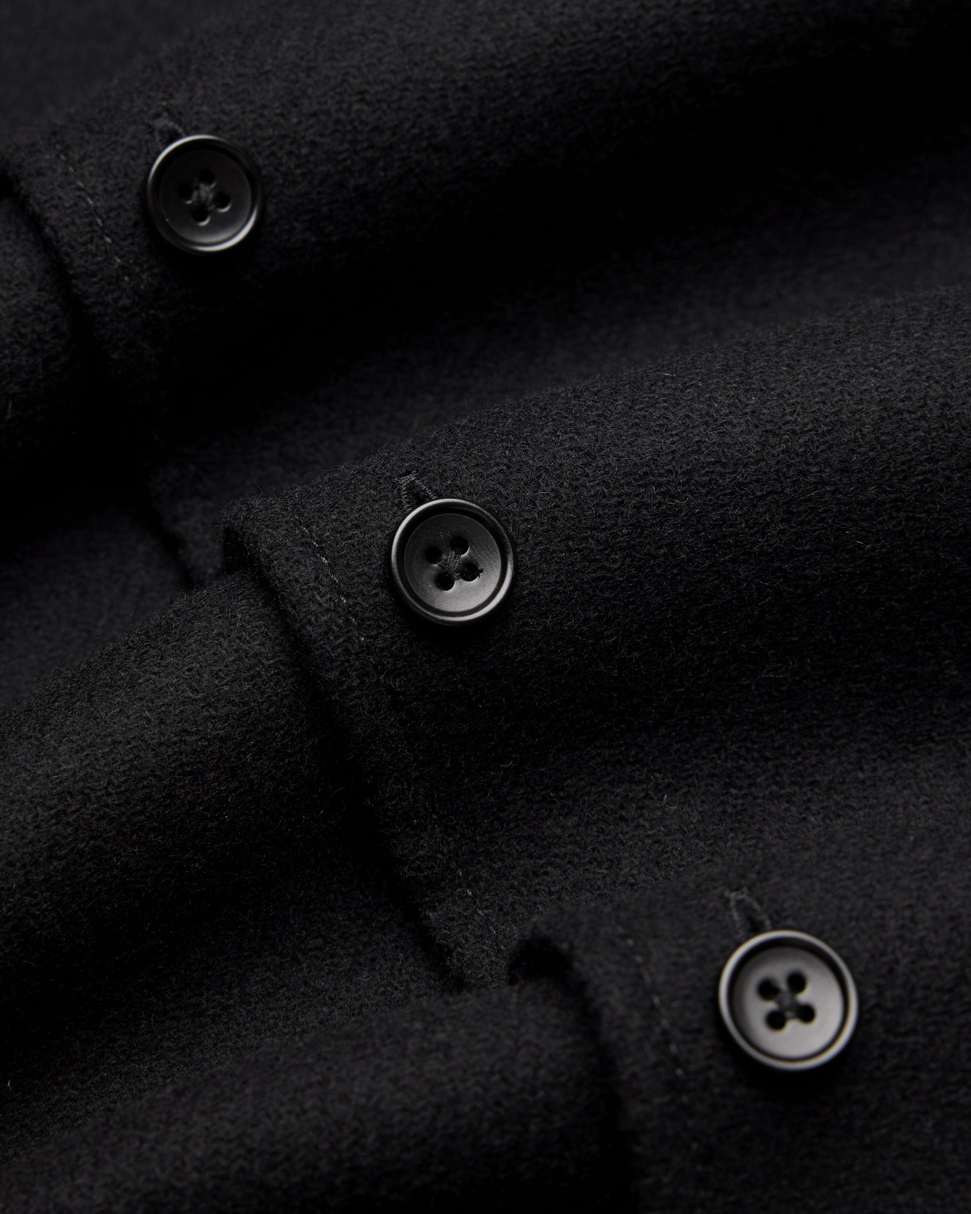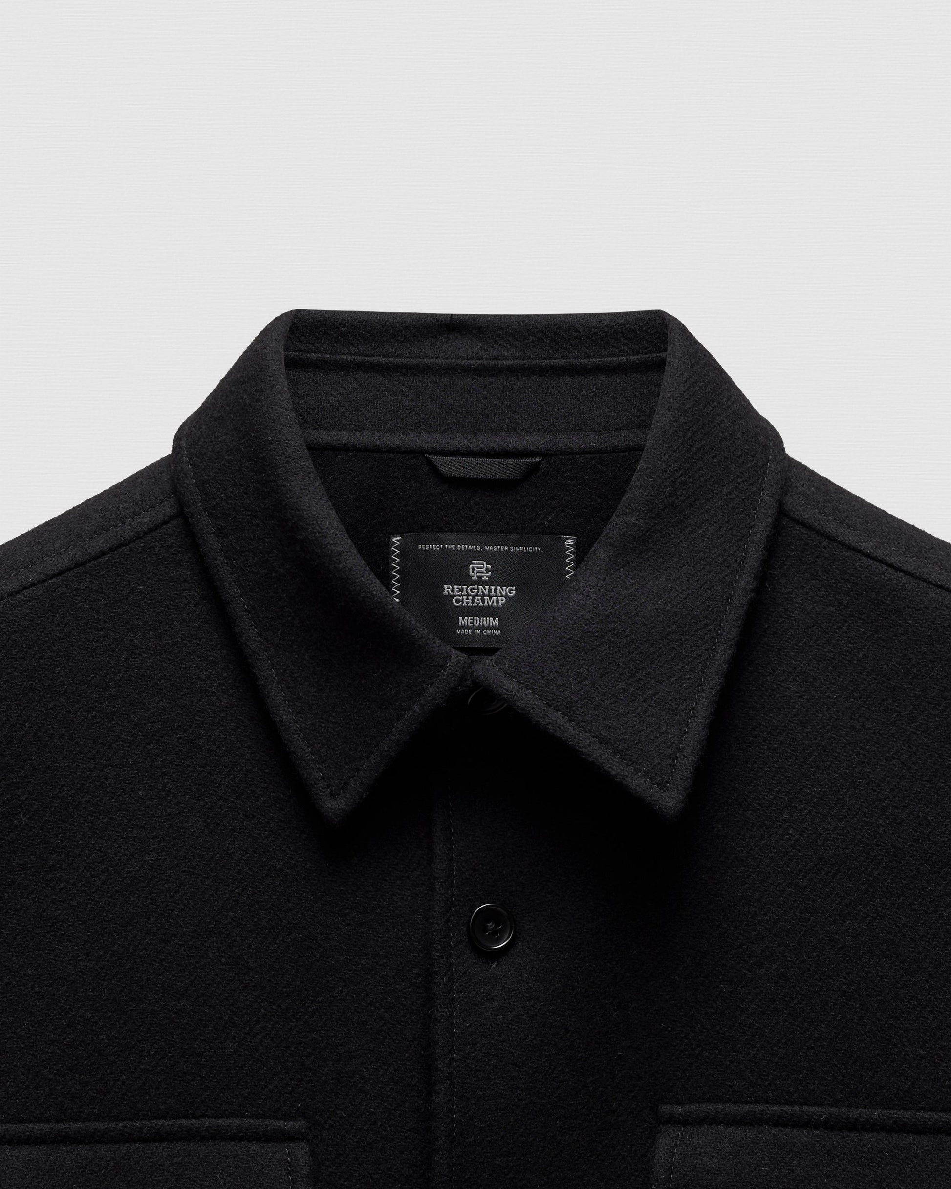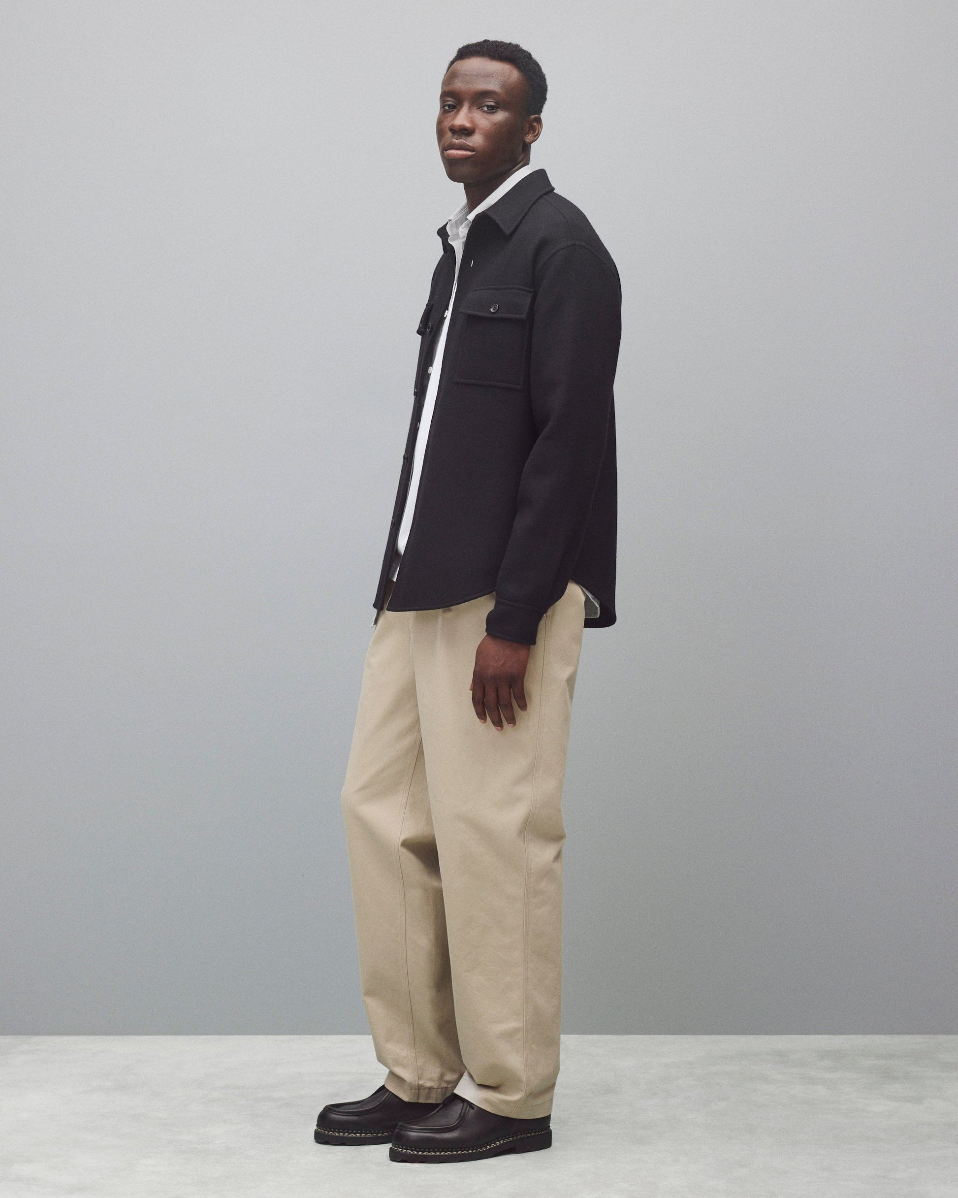 Versatile for the cooler months, this overshirt is crafted from Italian virgin wool with a brushed, felted finish for added warmth. Cut in a standard fit for easy layering. Designed with a pointed collar, buttoned chest pockets, corozo buttons, a curved hem, and tonal monogram embroidery at the left cuff placket.