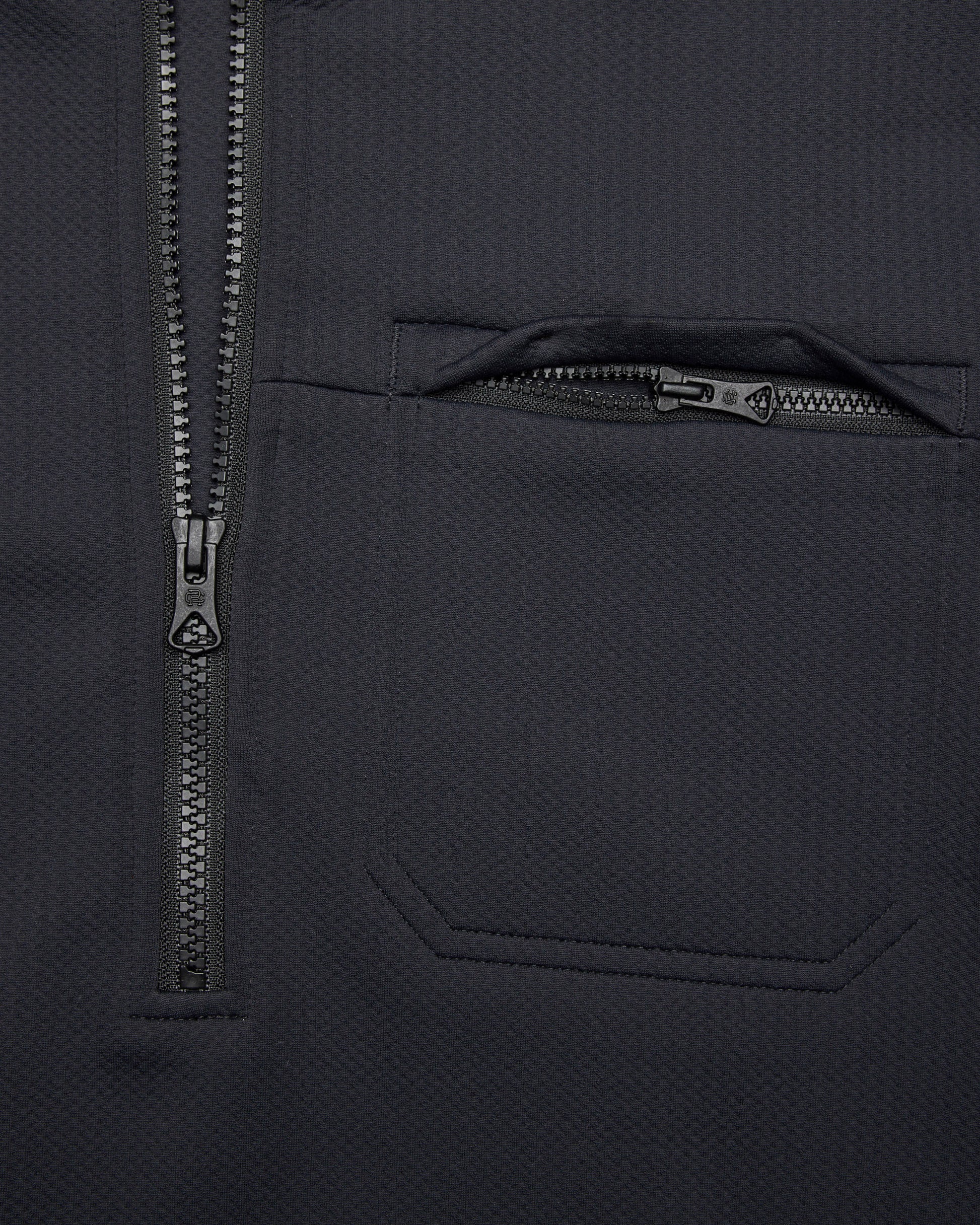 A dual-knit quarter zip engineered to provide efficient warmth in cooler conditions. This double knit stretch fabric features a textured face and smooth reverse, for exceptional next-to-skin comfort. Constructed in a trim athletic fit, with a mock neck collar, YKK Vislon zip closure, zip chest pocket, and self-fabric cuffs and hem.