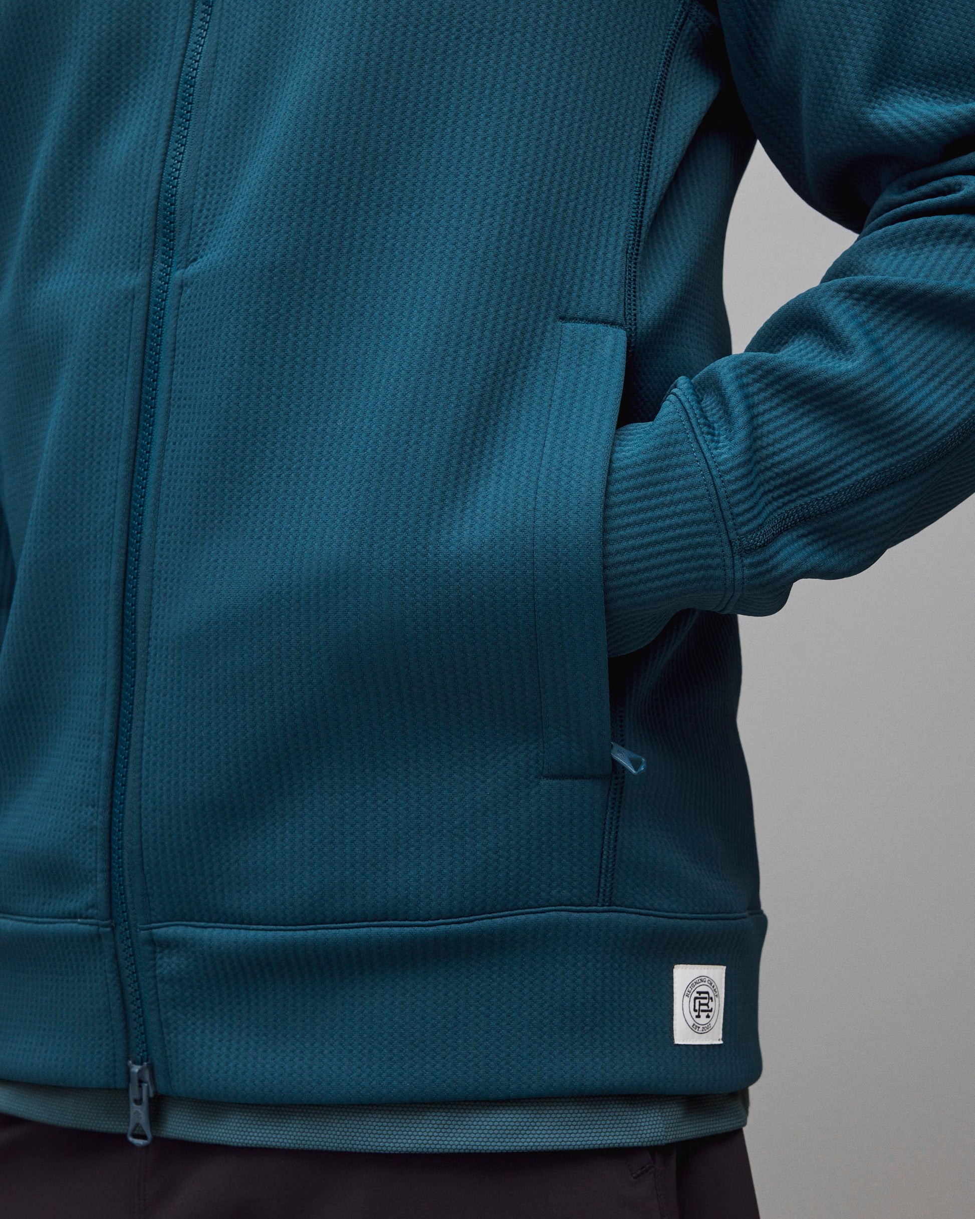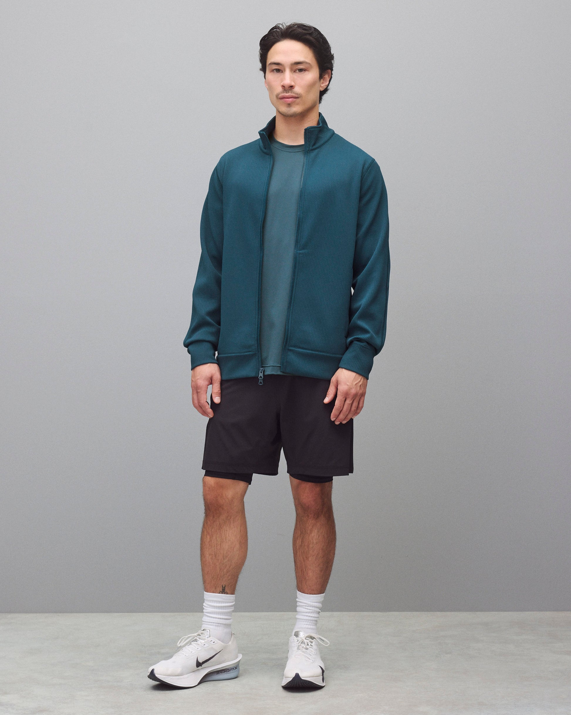 A dual-knit track jacket engineered to provide efficient warmth in cooler conditions. This double knit stretch fabric features a textured face and smooth reverse, for exceptional next-to-skin comfort. Constructed in a trim athletic fit, with a mock neck collar, YKK Vislon two-way zip closure, inseam zip pockets, and self-fabric cuffs and hem.