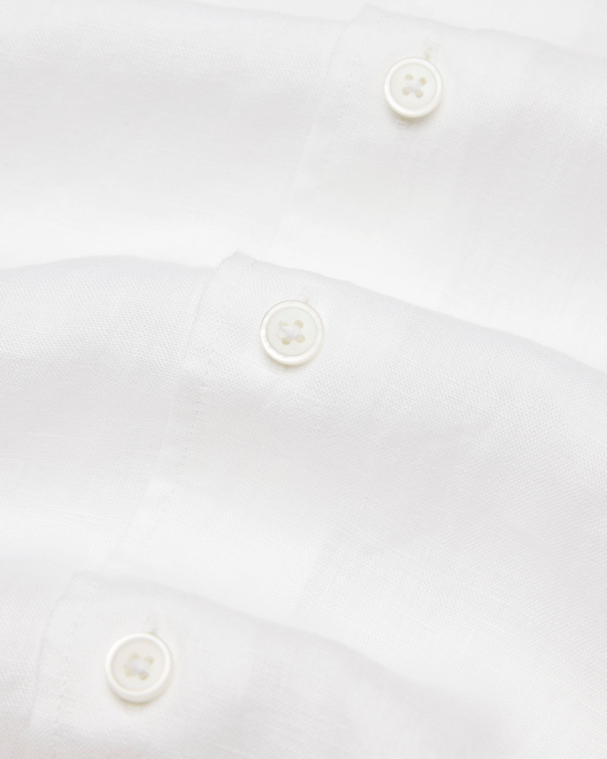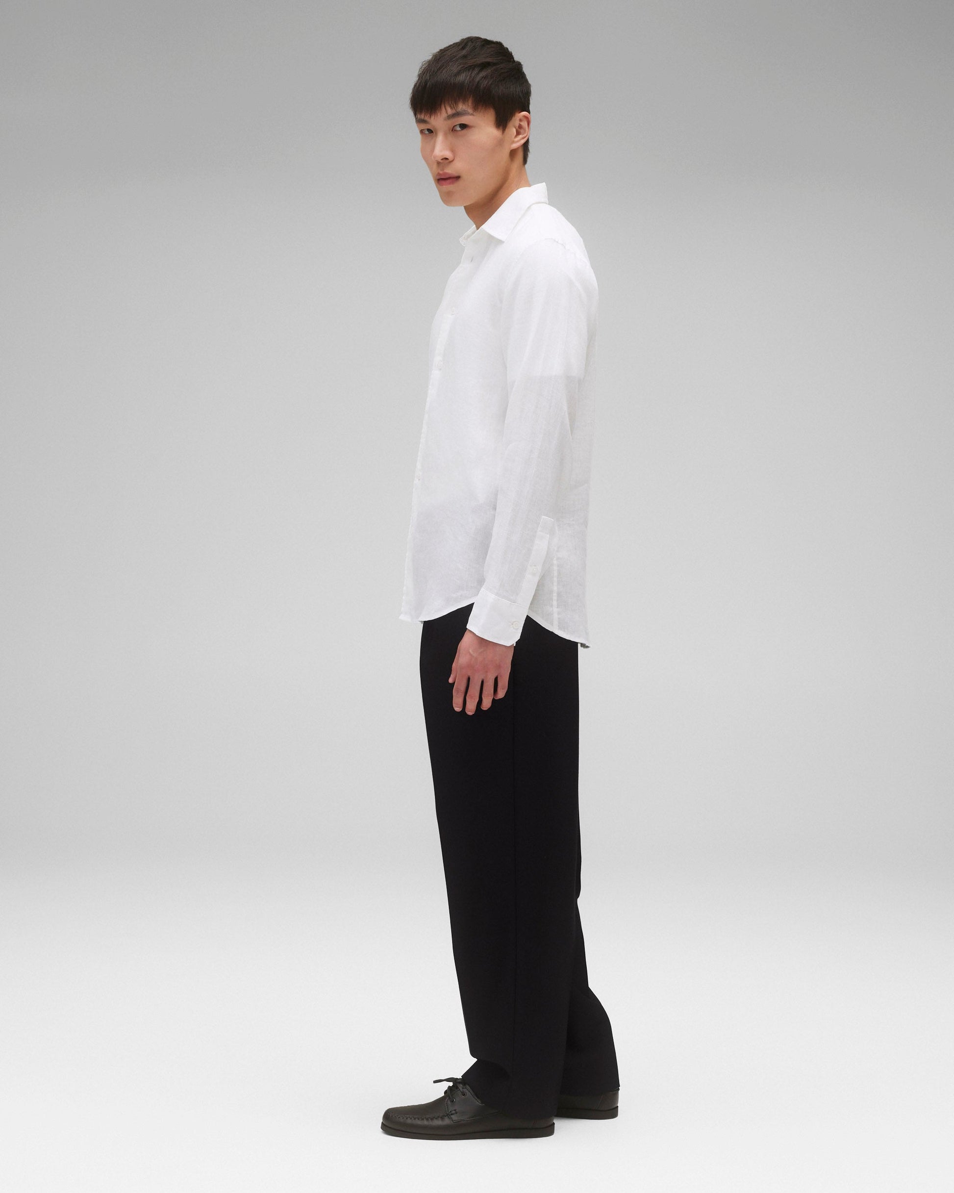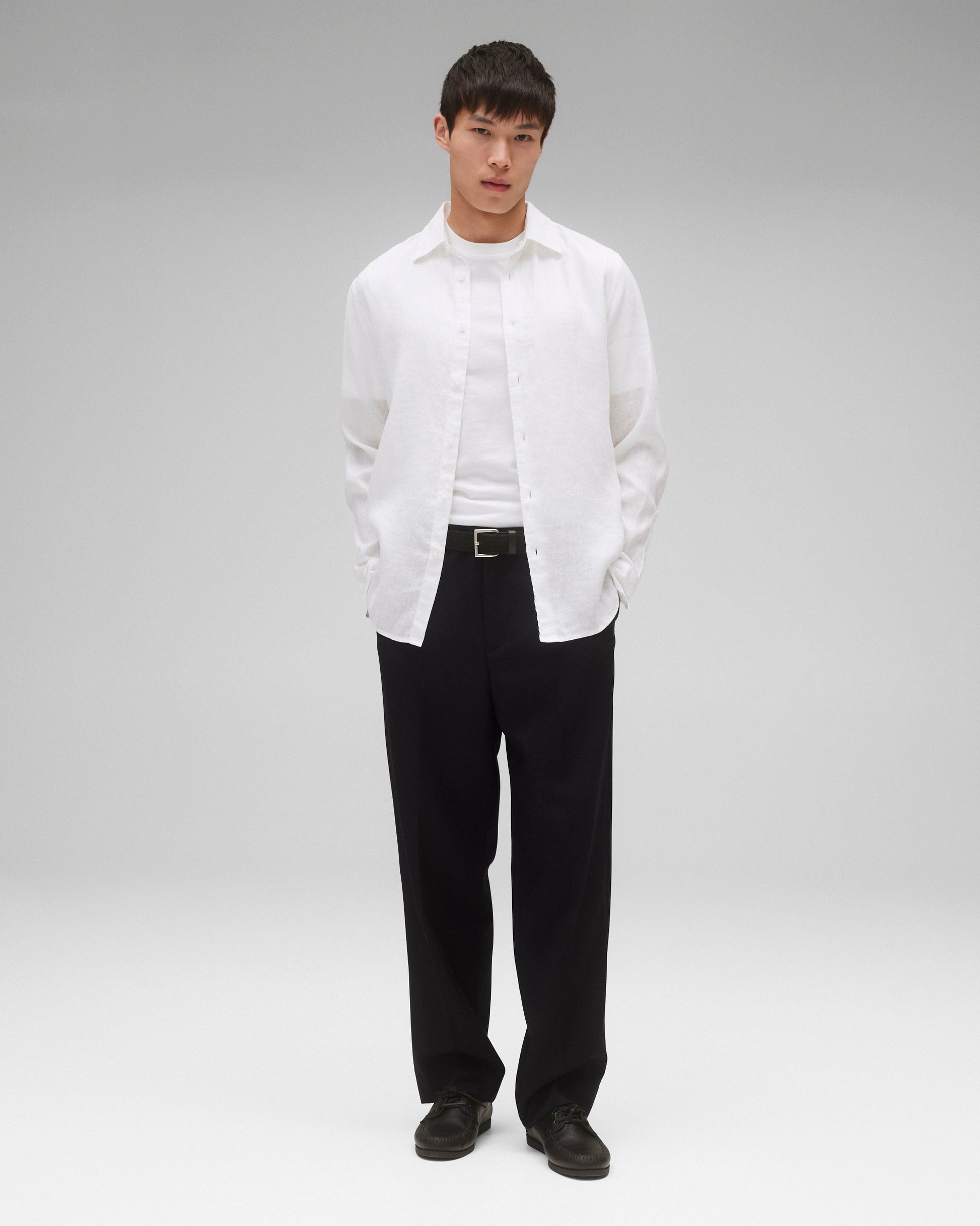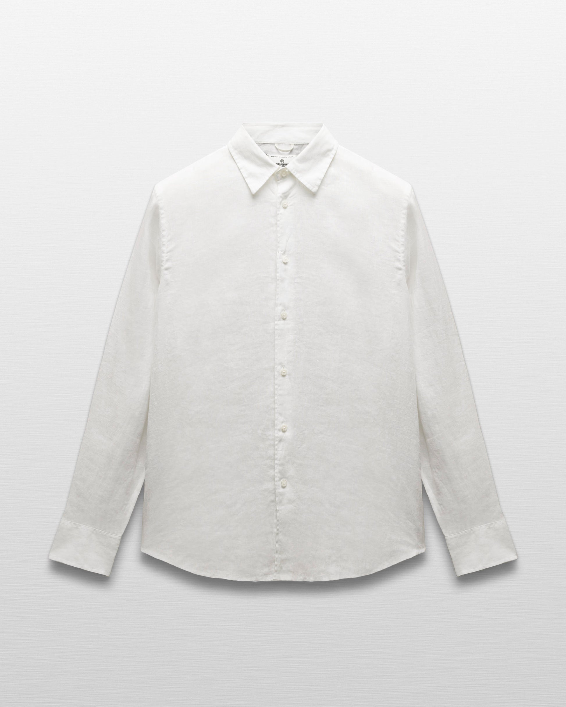 This summer long sleeve button-up shirt is crafted from airy, lightweight linen with a naturally textured hand. Featuring a standard fit, with full cut sleeves and torso. Designed with clean french seams, a pointed collar, faux shell buttons, a curved hem, and side gussets for a tailored drape.
