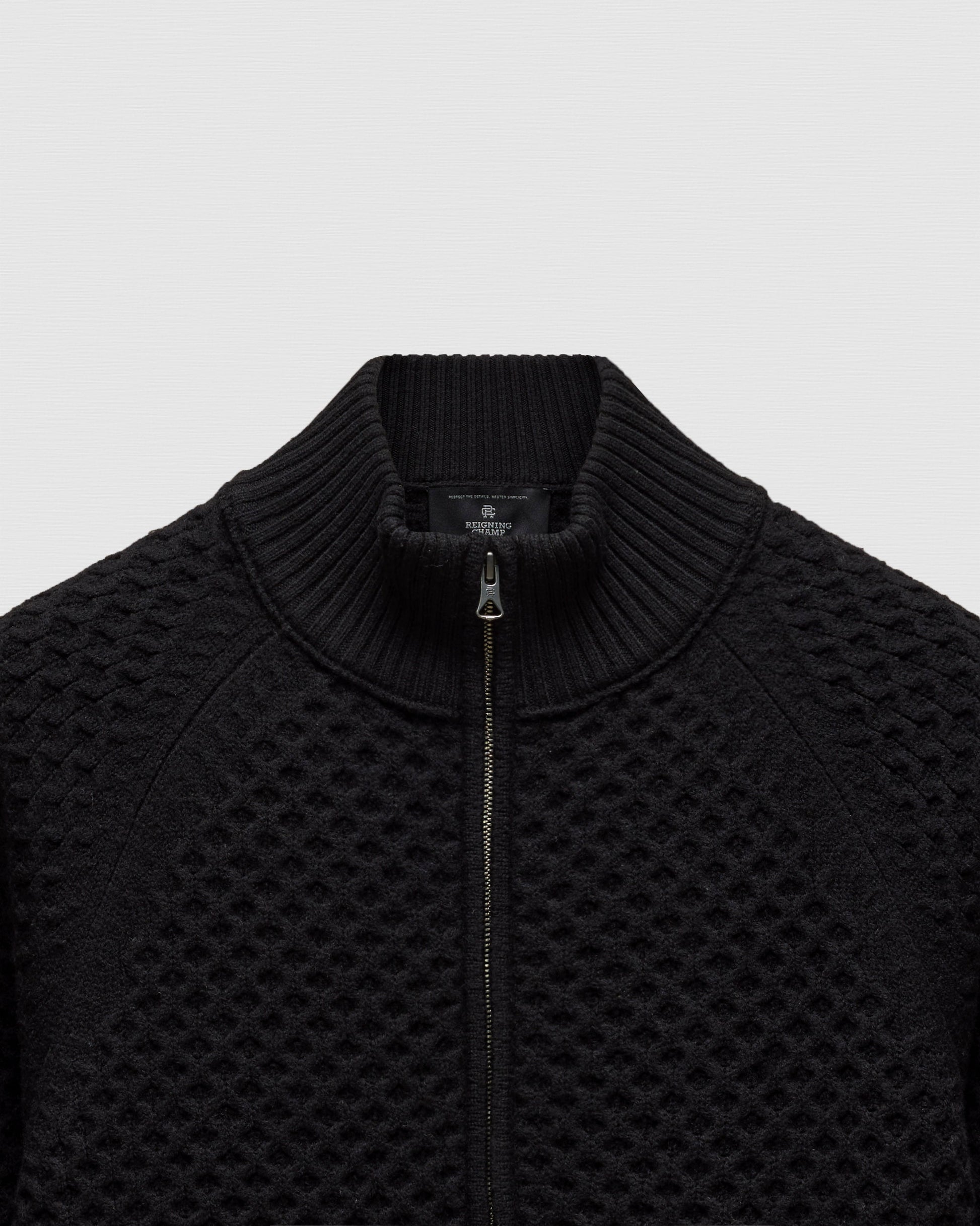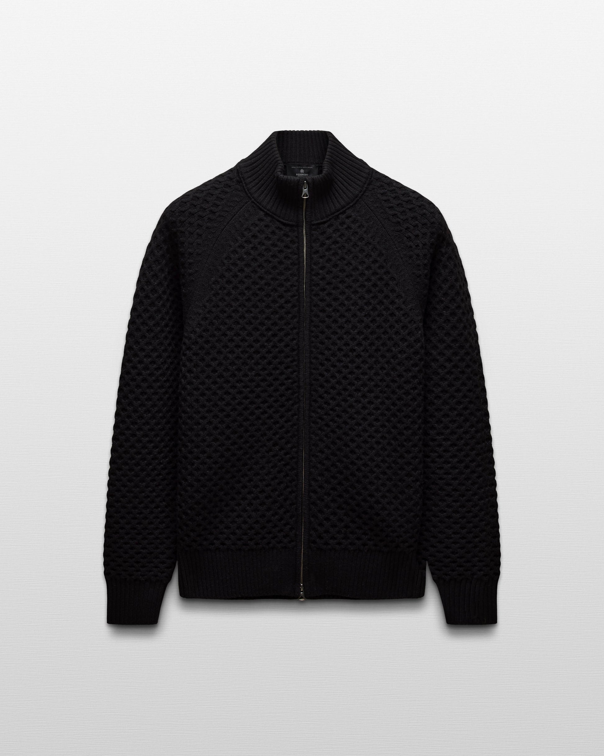 This mock neck zip up is crafted from honeycomb-stitched merino wool, milled in Italy. Featuring a standard fit, with fully fashioned seam construction. Designed with raglan sleeves, a two-way YKK metal zipper, and rib knit side panels, cuffs, and hem.