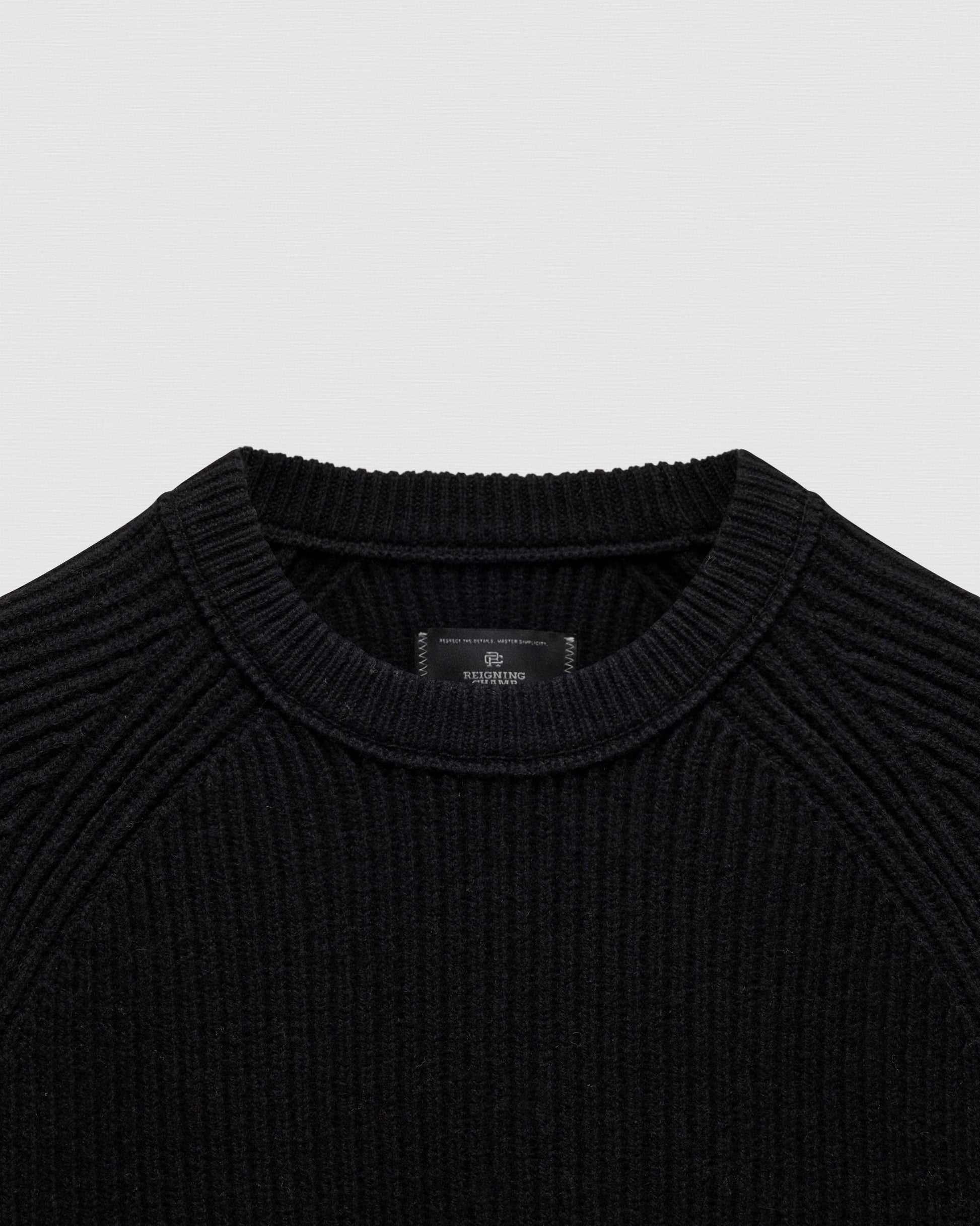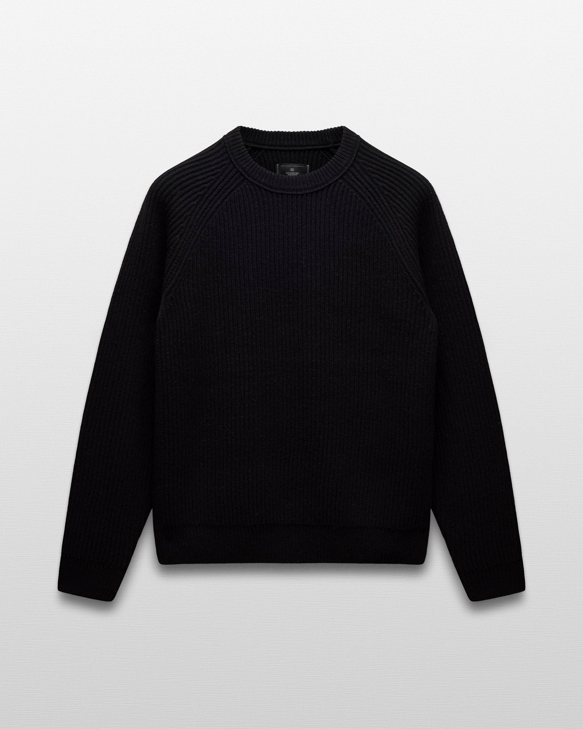 This knitted crewneck is crafted from nep merino wool, featuring small knots or clusters to impart distinctive character and feel. Constructed in a standard fit, with fully fashioned seams. Designed with a rib knit collar, raglan sleeves, side gussets, and rib knit cuffs and hem.
