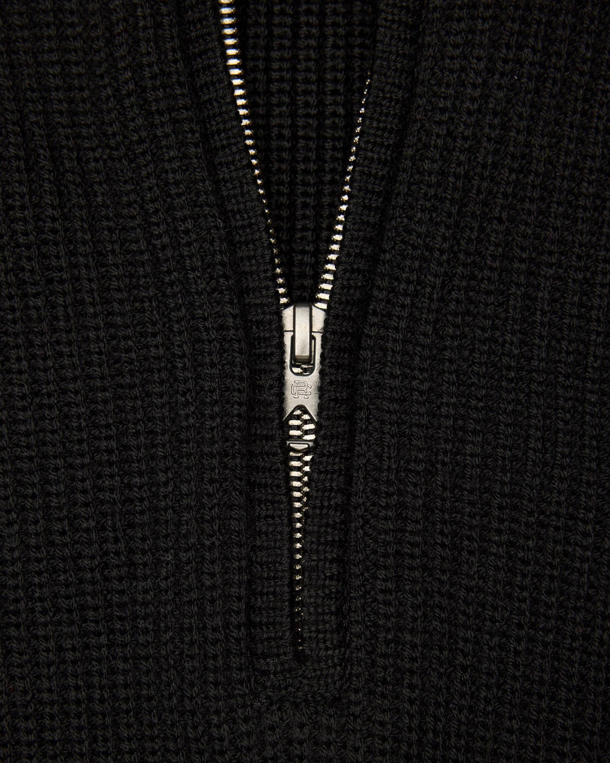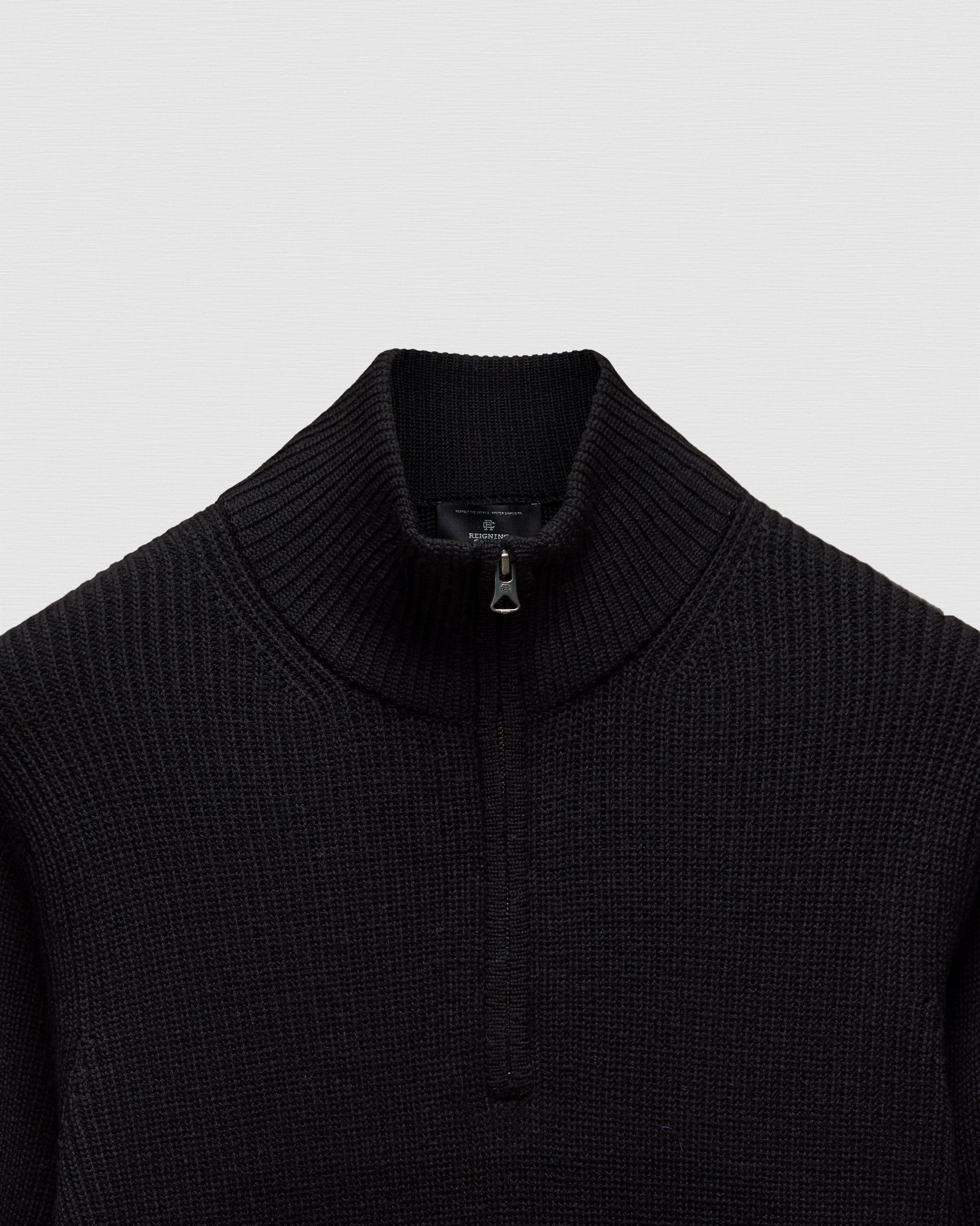 This mock neck quarter zip is crafted from extrafine Italian merino wool, prized for its natural softness, breathability, and temperature regulating properties. Featuring a standard fit, with fully fashioned seams. Designed with a convertible collar, a YKK metal zipper, and lycra-blended trim to enhance shape retention and durability.
