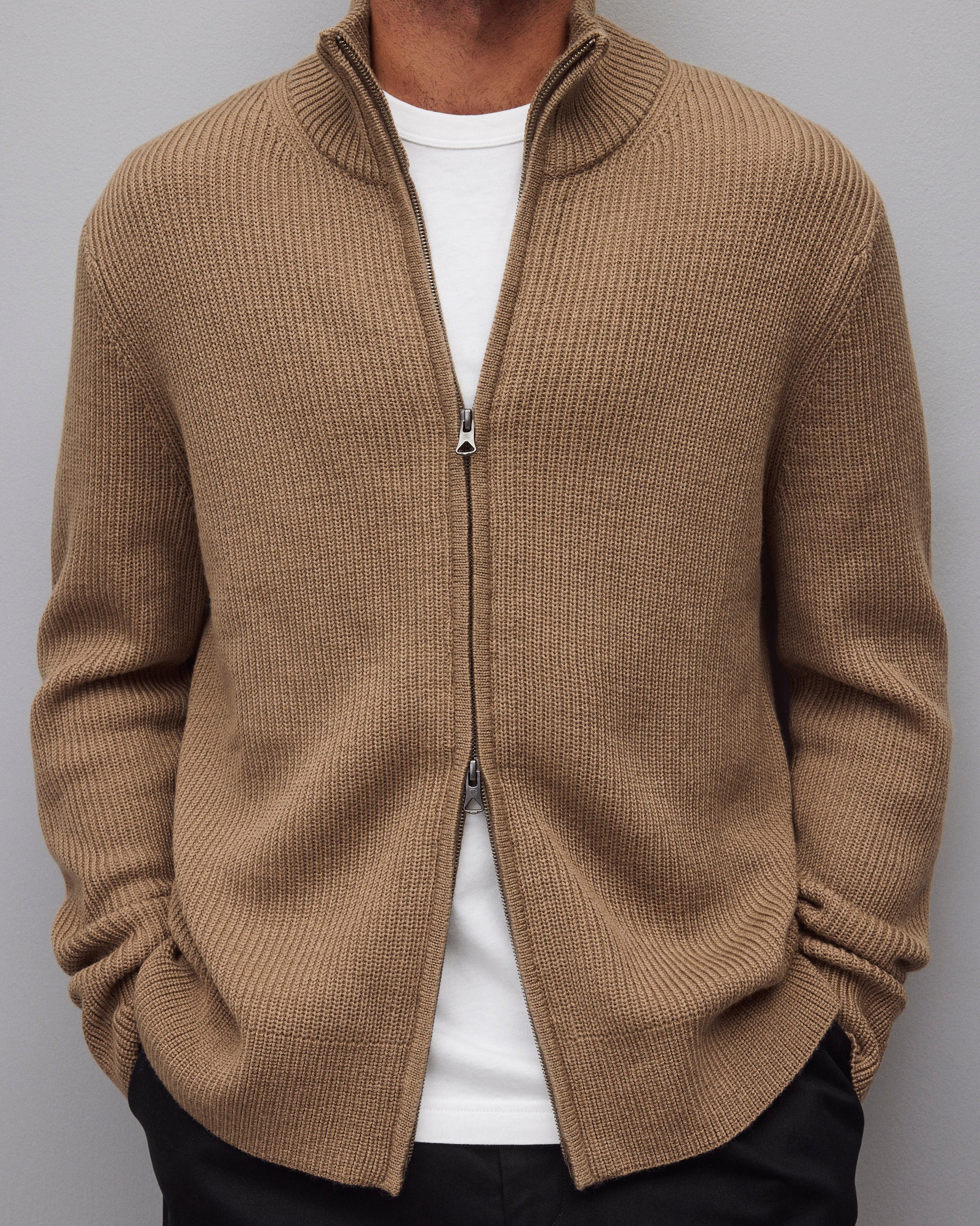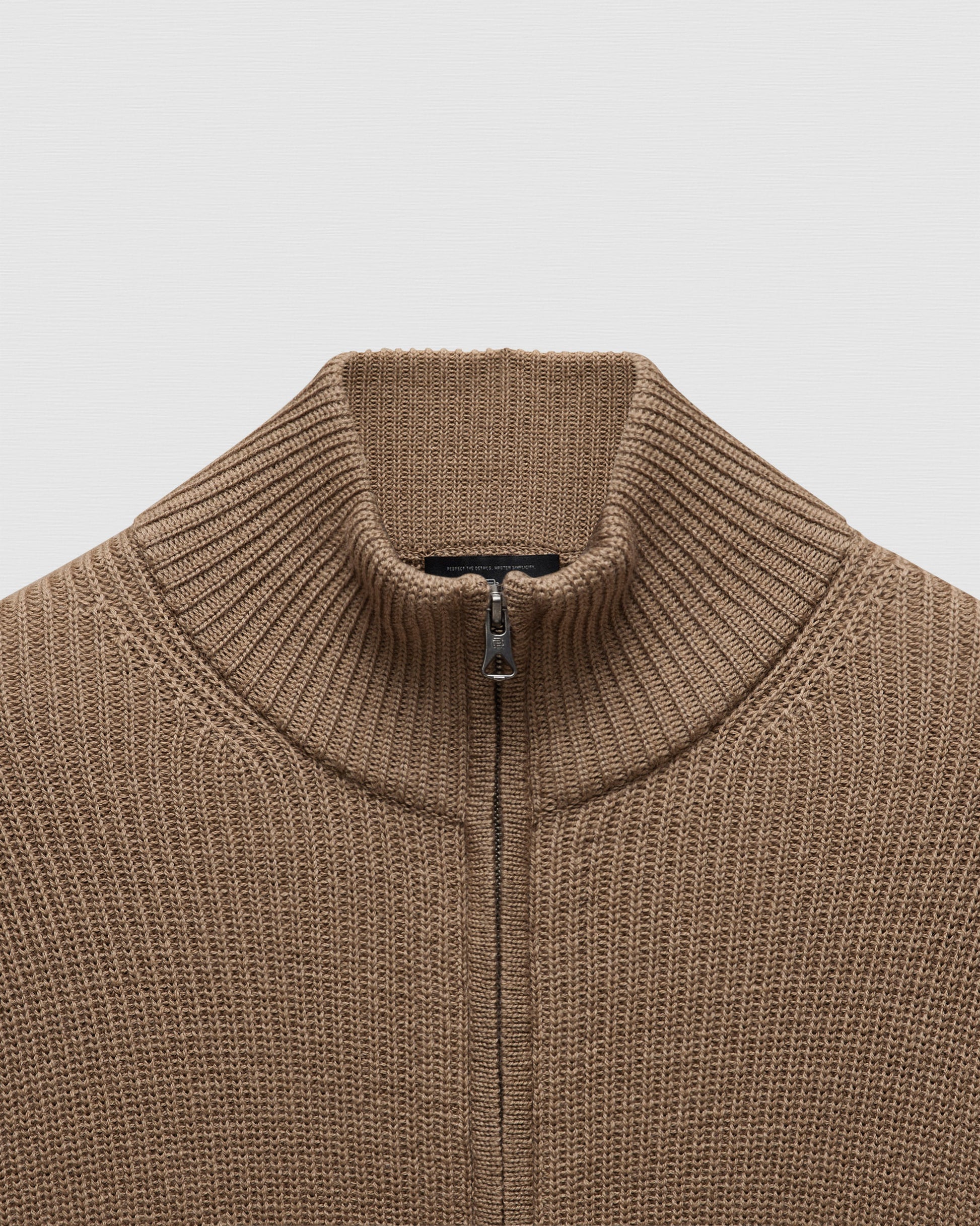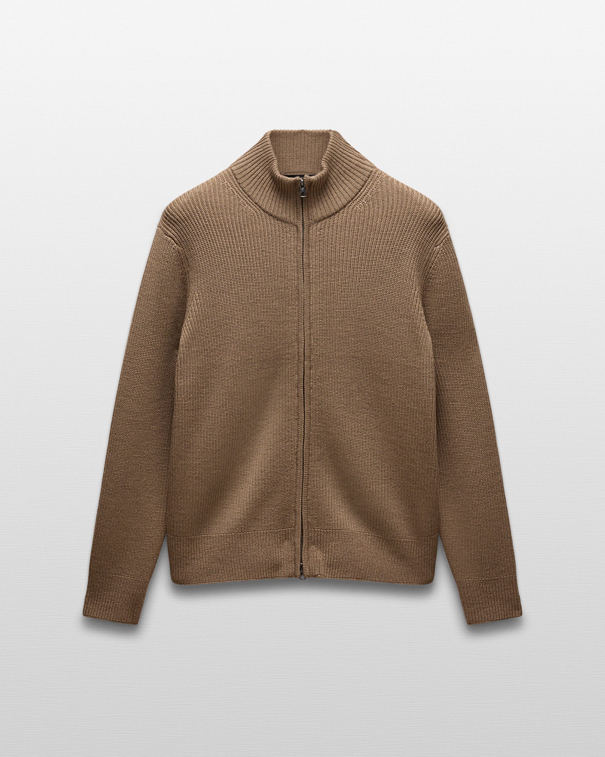 This mock neck zip up is crafted from premium merino wool milled in Italy. Featuring a standard fit, with fully fashioned seam construction. Designed with a convertible collar, a two-way YKK metal zip closure, and rib cuffs and hem.