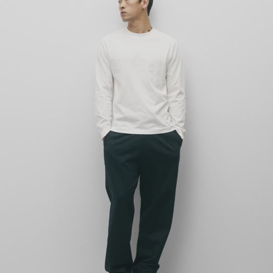 Our midweight long sleeve T-shirt is made from premium cotton, balancing substantial structure with a soft hand. Featuring a standard fit that tapers slightly from the chest to the waist hem. Designed with a wide rib collar, semi-raglan sleeves, and signature flatlock construction.