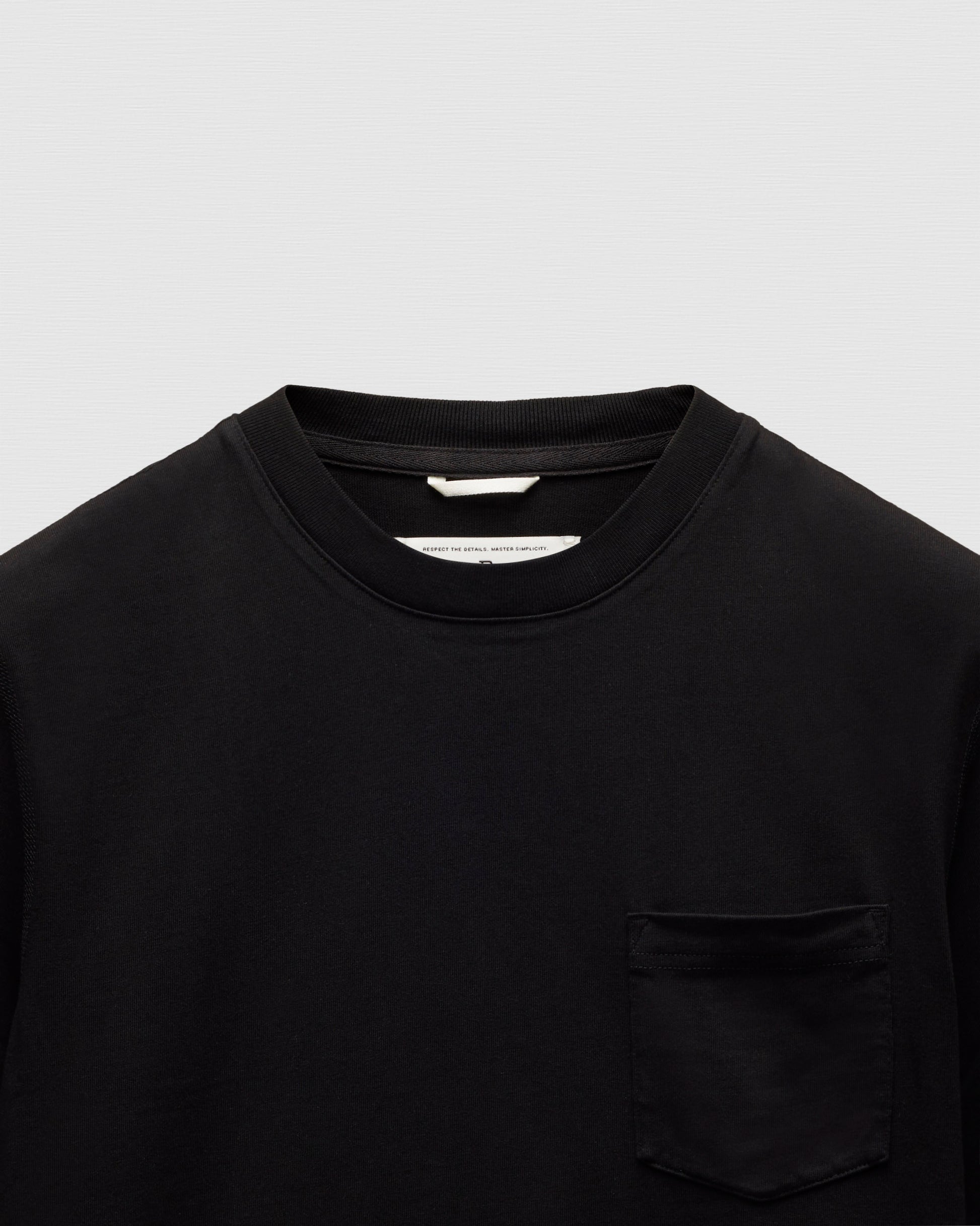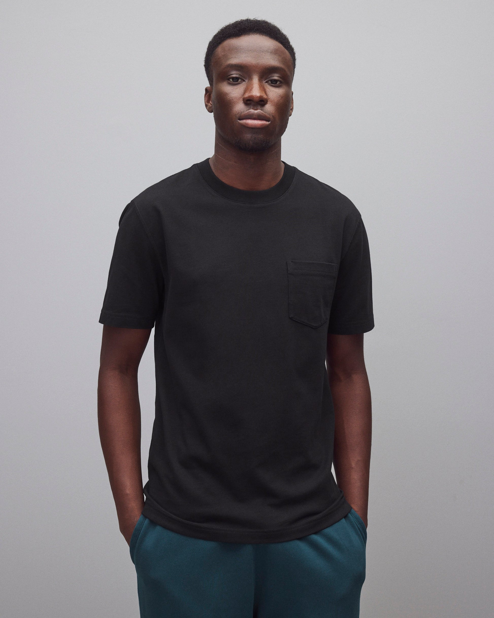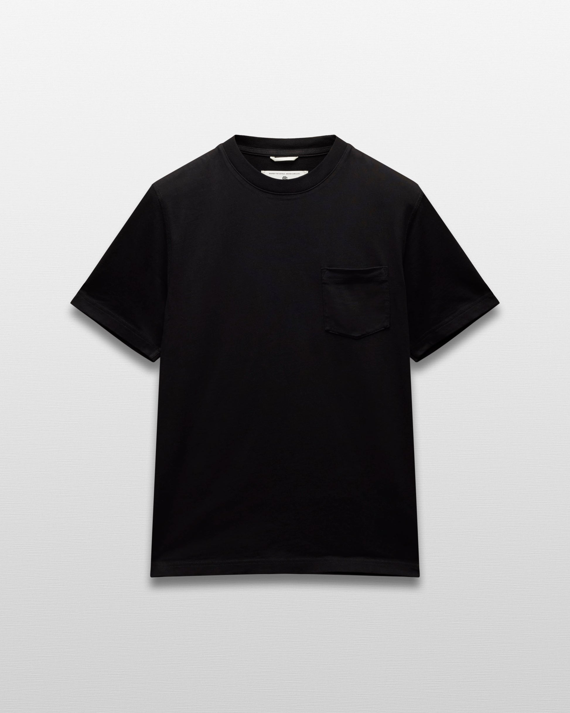 Our midweight short sleeve pocket T-shirt is made from premium cotton, balancing substantial structure with a soft hand. Featuring a standard fit that tapers slightly from the chest to the waist hem. Designed with a wide rib collar, set-in sleeves, left chest pocket, and signature flatlock construction.