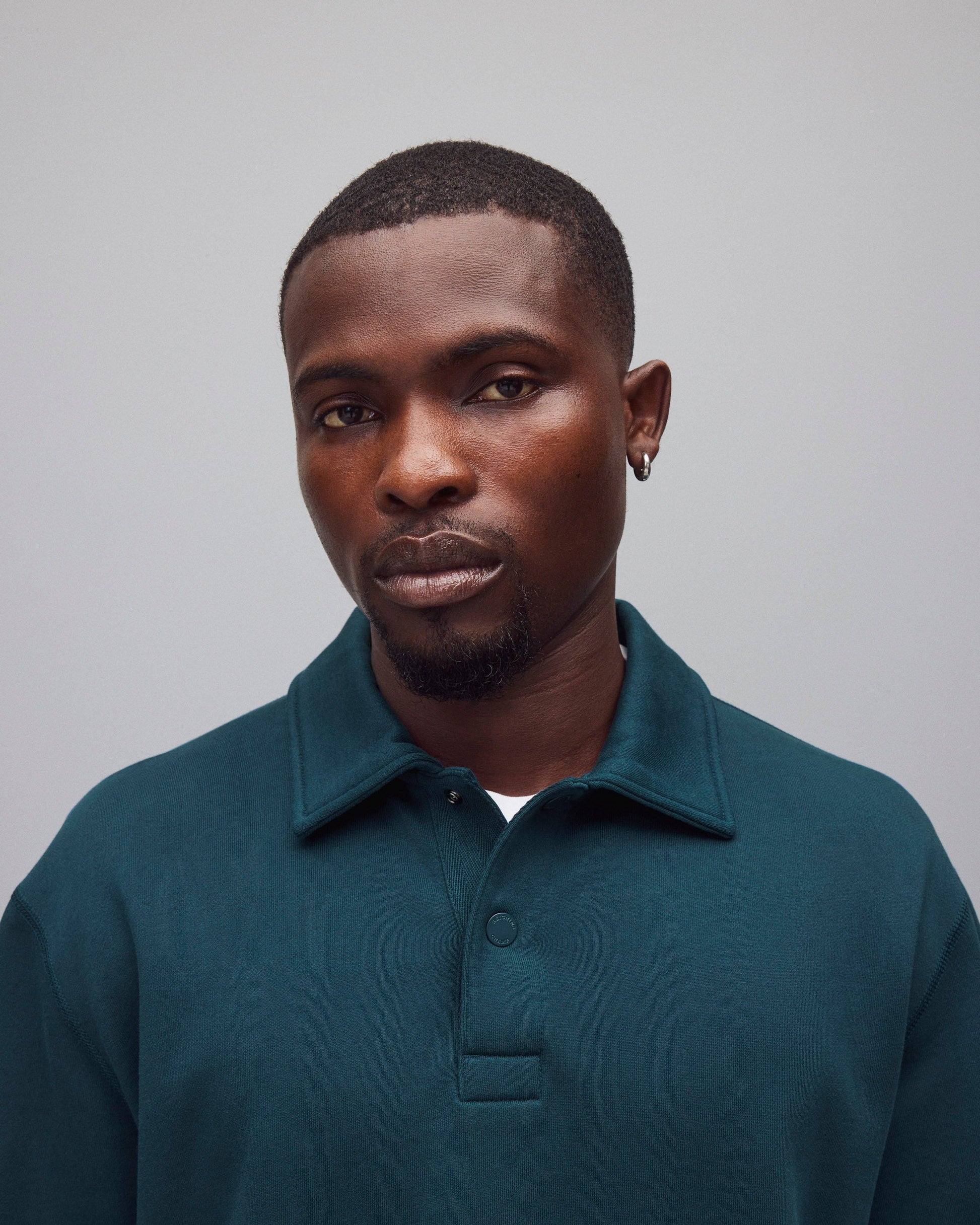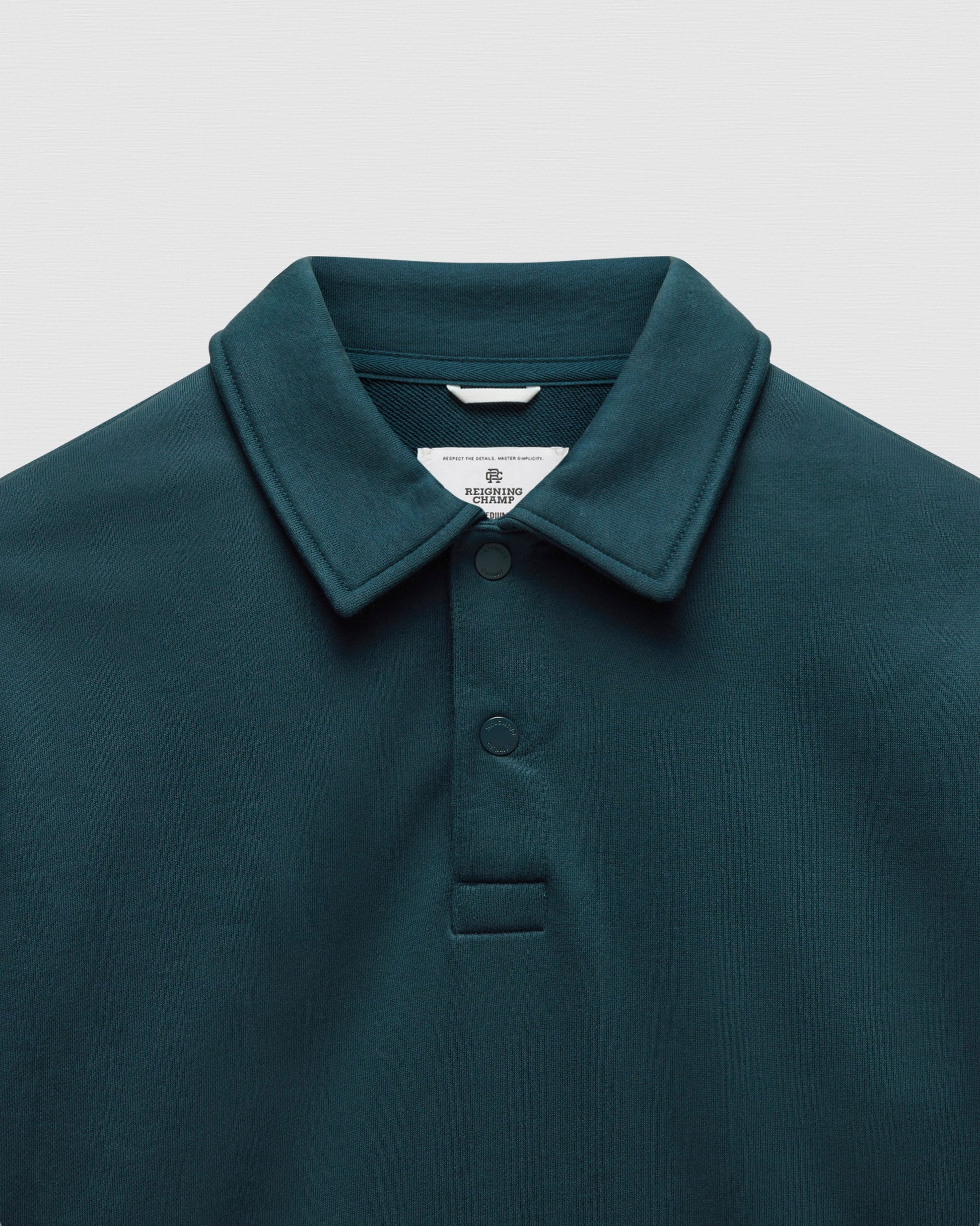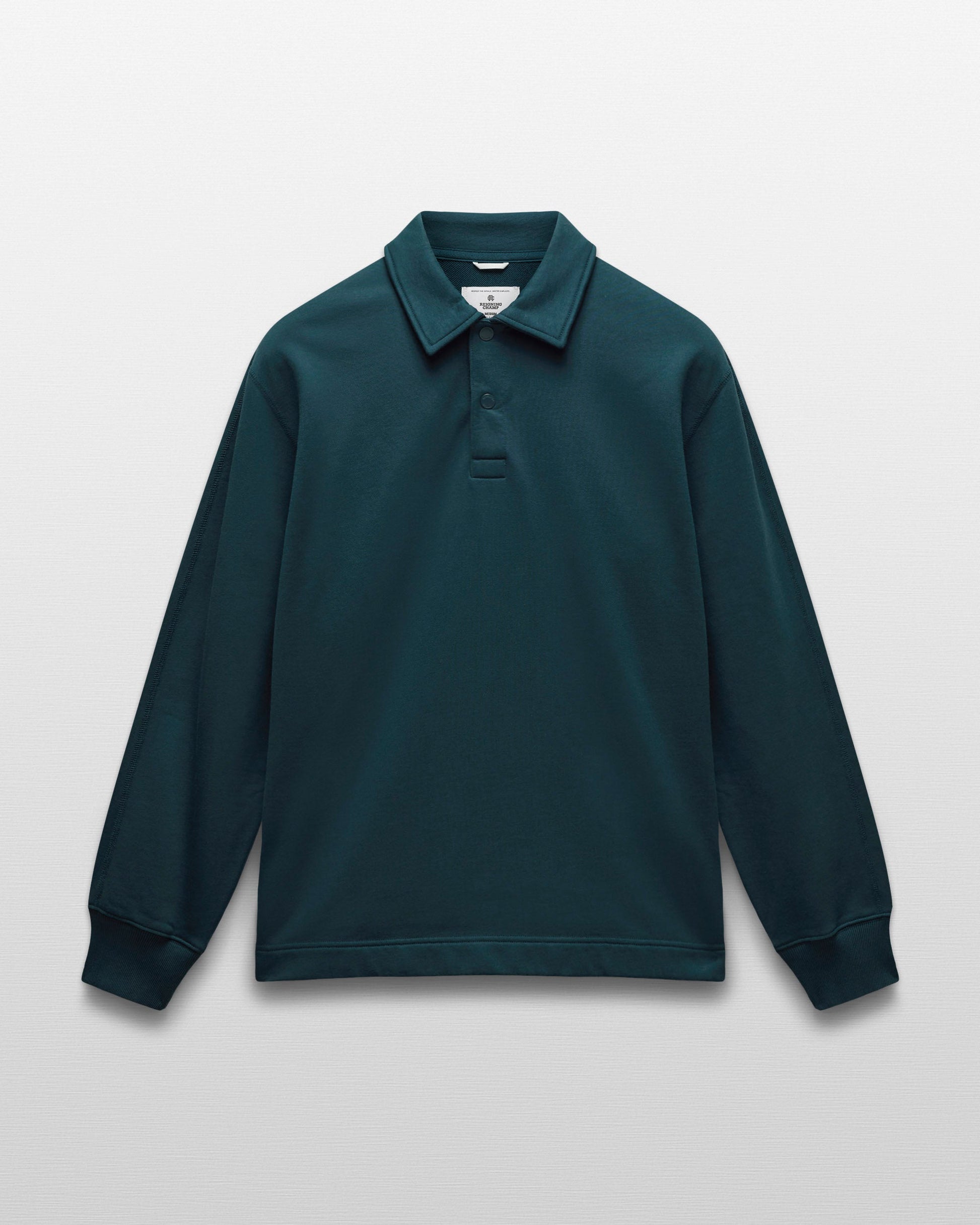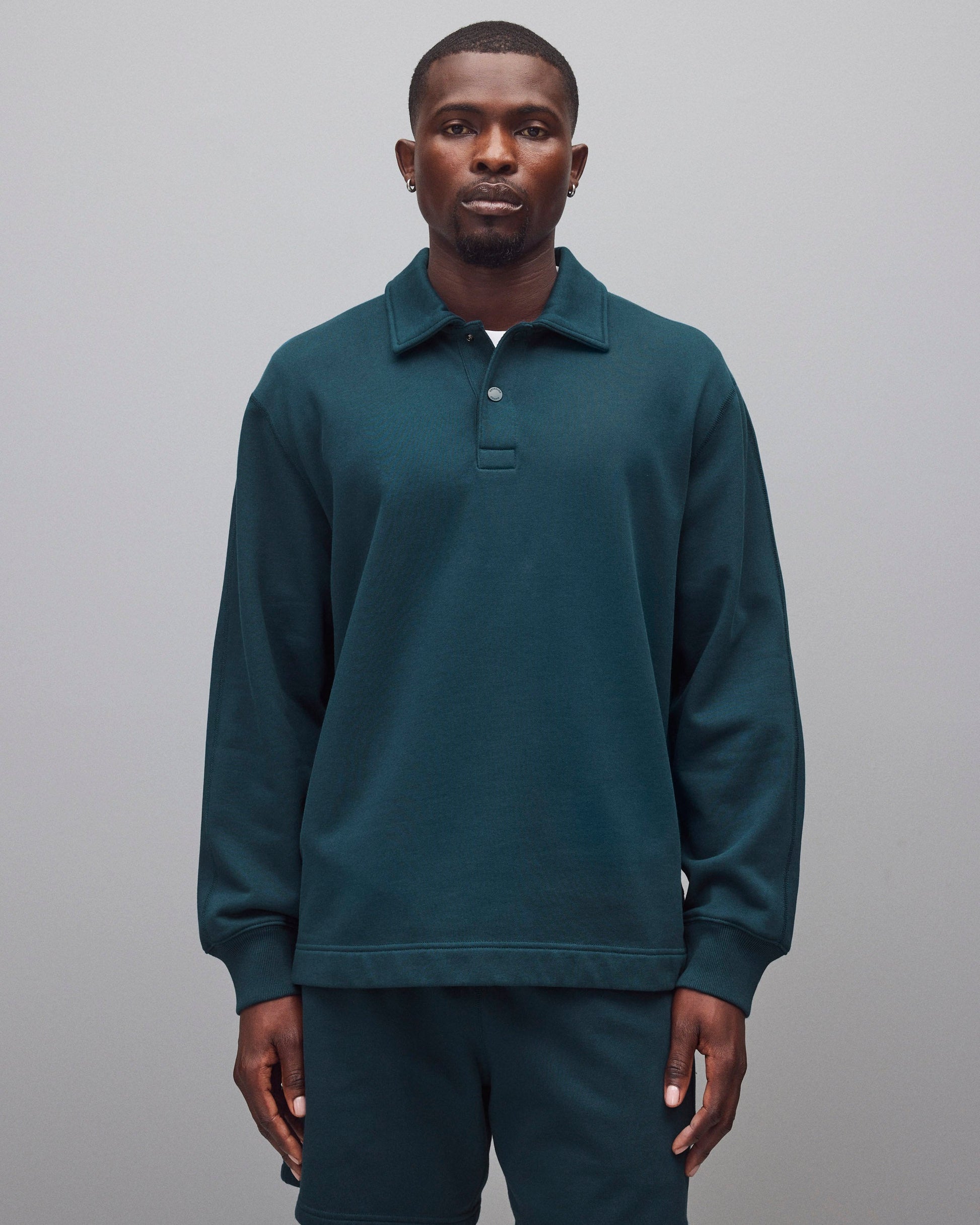 This collared rugby sweatshirt is made from premium Midweight Terry for an ideal balance of comfort and structure. Designed with metal logo snaps, a herringbone tape placket, semi-raglan sleeves, a side slit hem, and premium rib.
