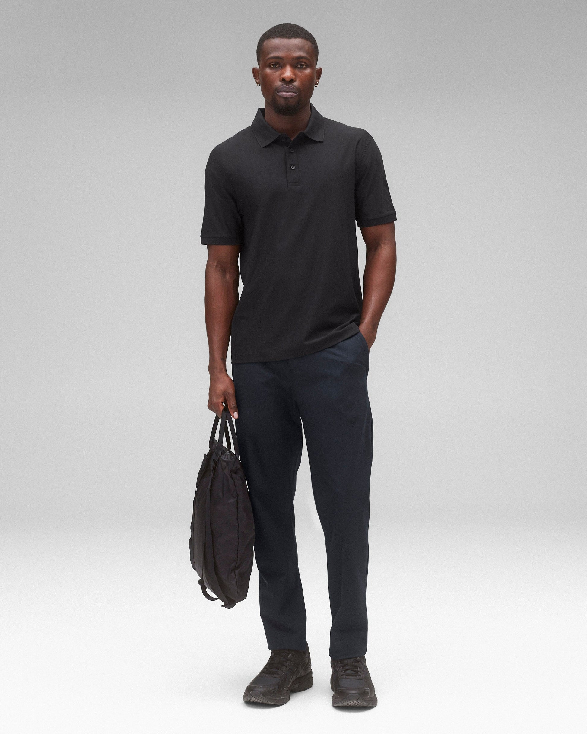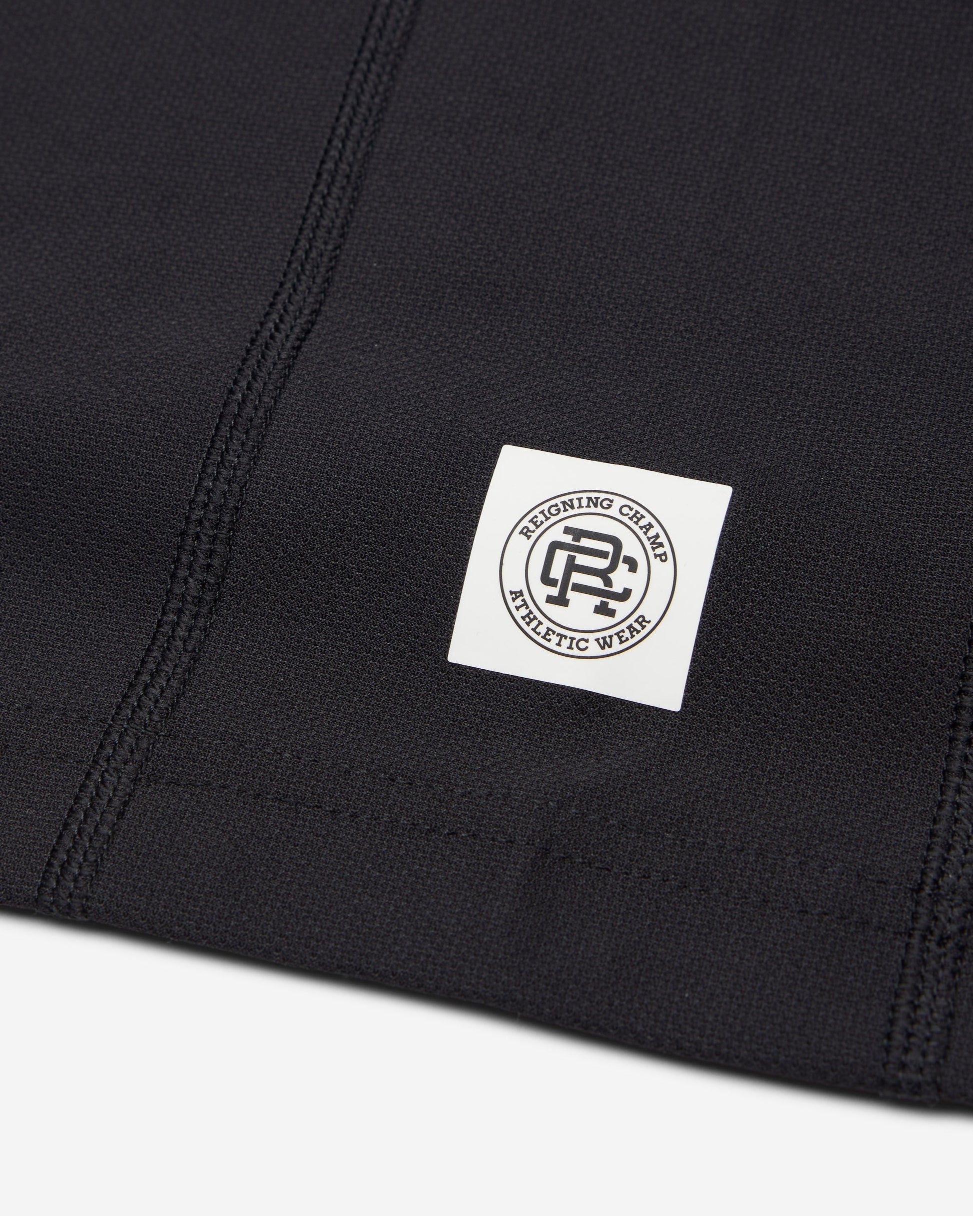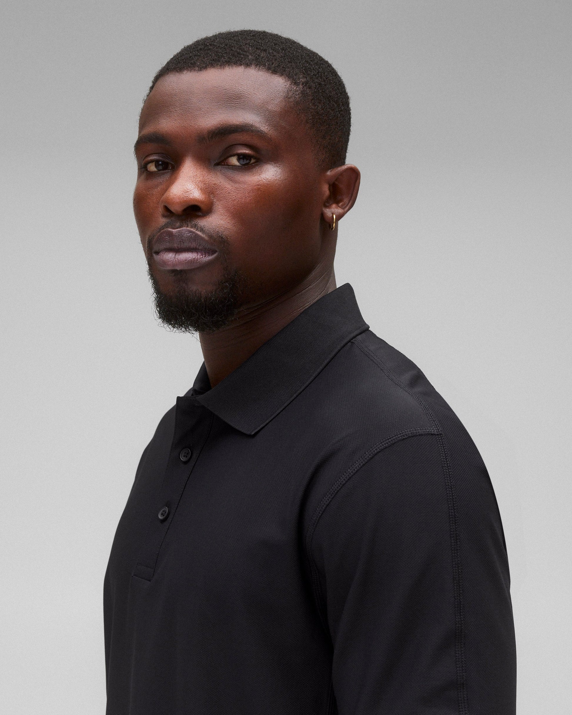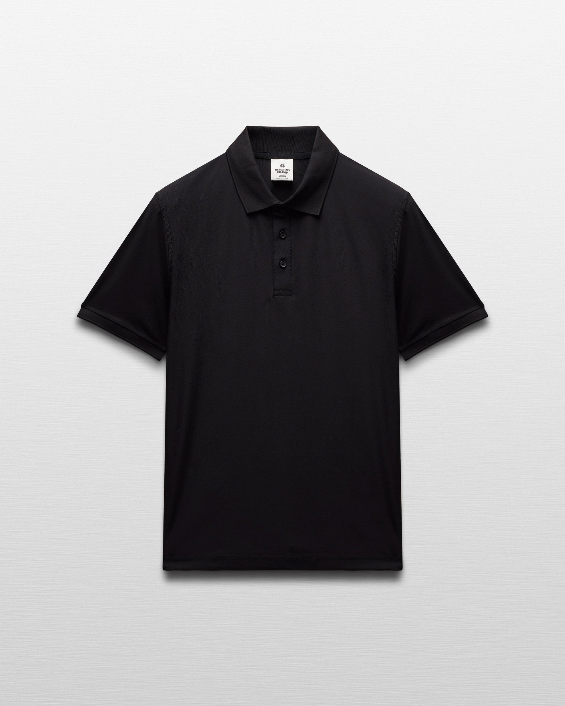 A technical polo handcrafted from nylon pique, engineered to wick moisture and dry rapidly when temperatures rise. Designed with a flat knit collar, a three-button placket, logo branded buttons, semi-raglan sleeves, and underarm gussets for unrestricted mobility.