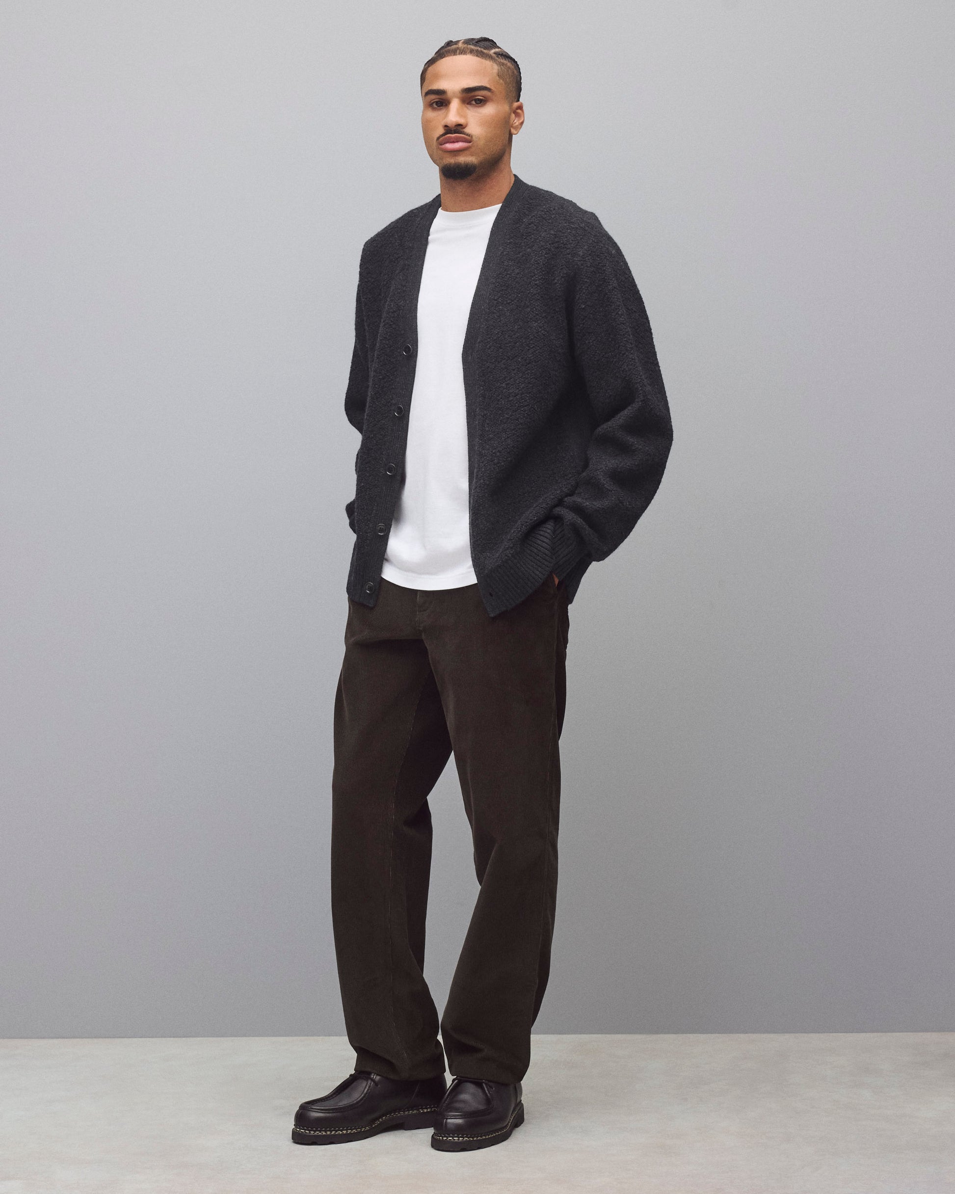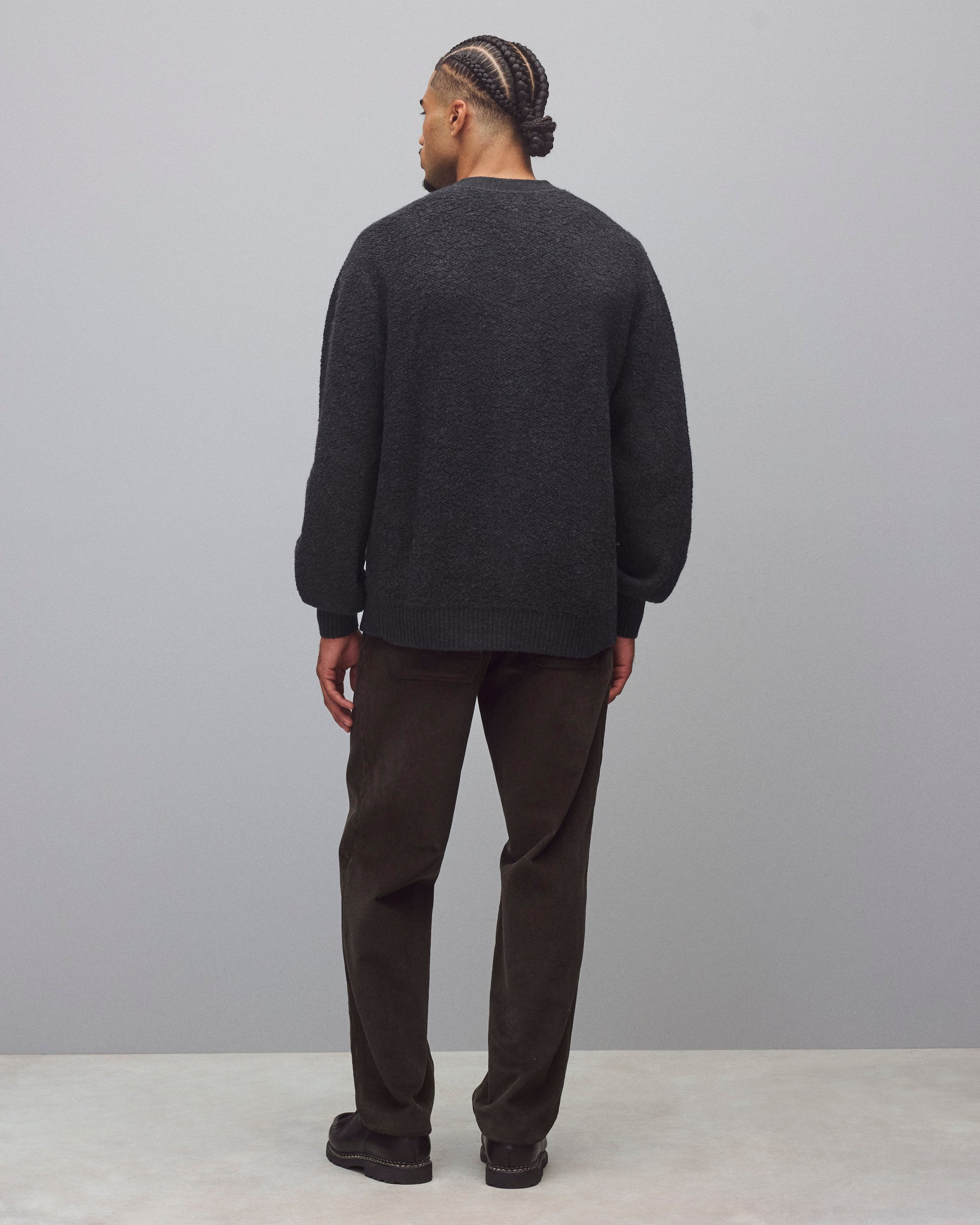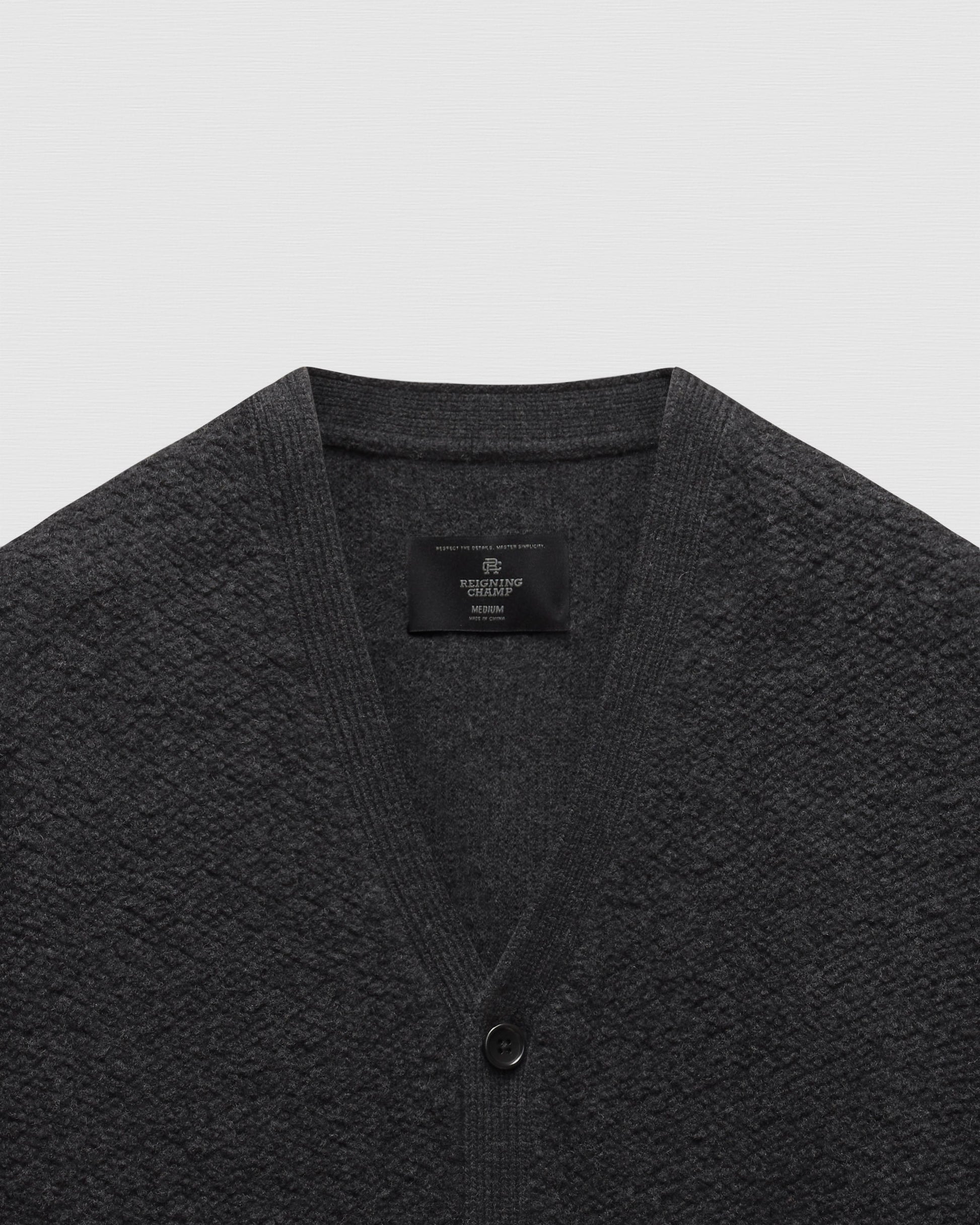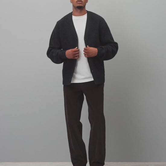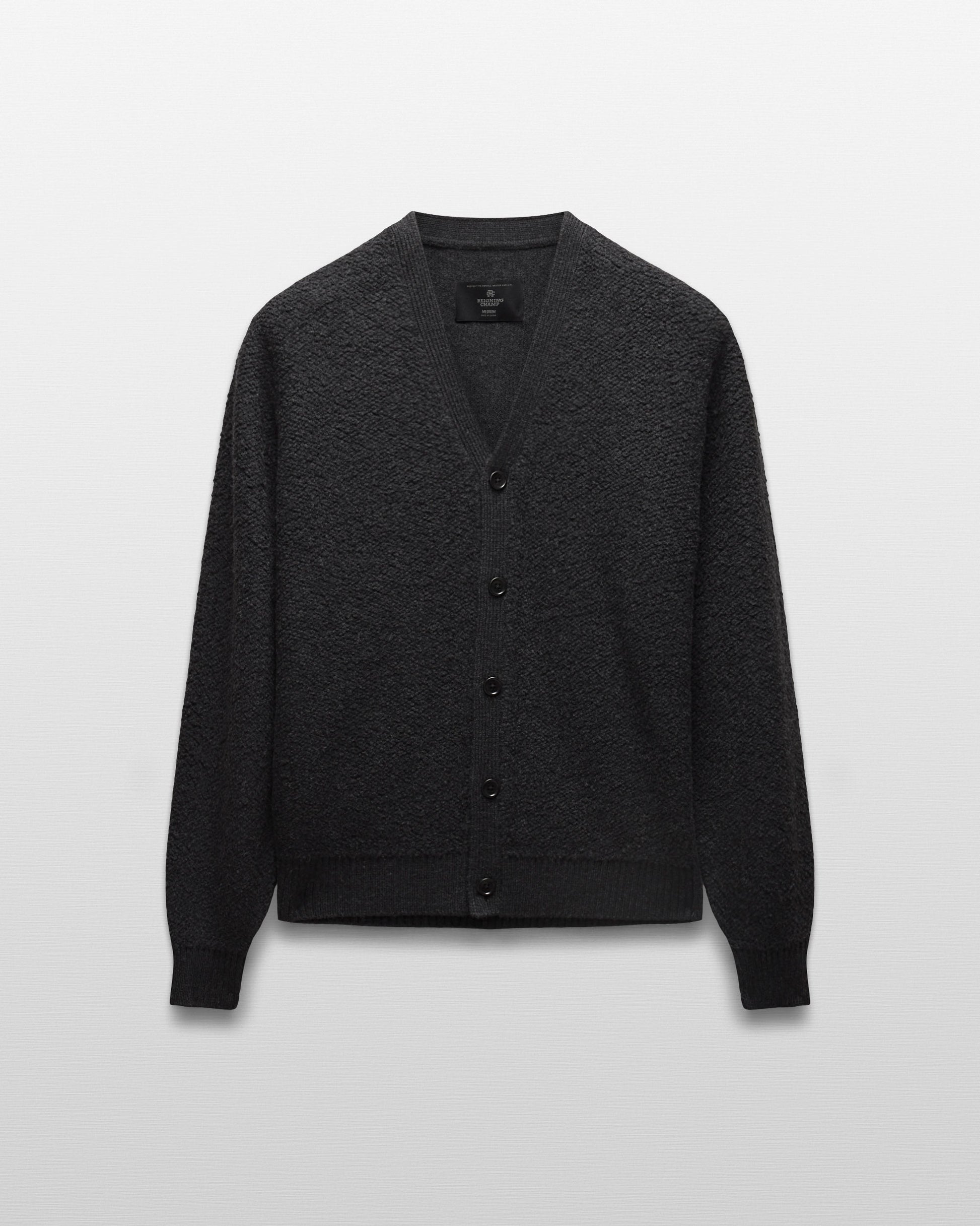 This winter-weight cardigan is knit from a merino-cotton blend with a curly, boucle-textured feel. Featuring a standard fit, with full-cut sleeves and torso to provide versatility for layering. Designed with a tonal corozo button placket, side gussets, and rib knit cuffs and hem. Finished with a raised needle punch logo at side hem.