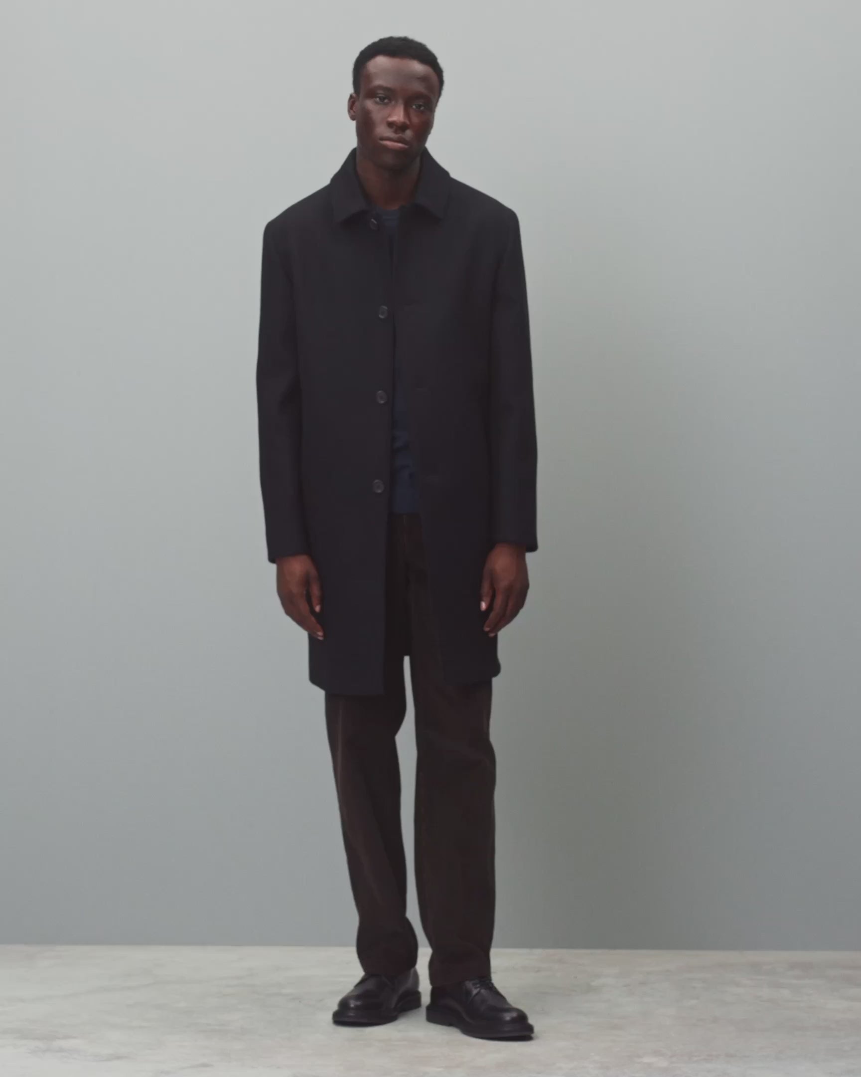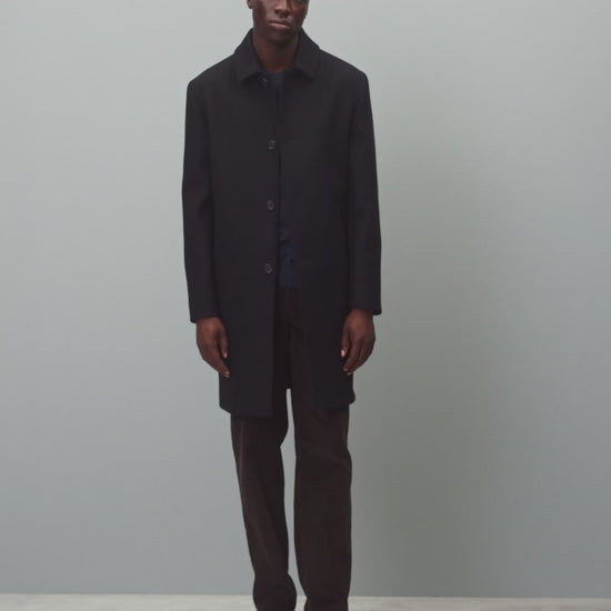 This single-breasted overcoat is crafted from an elegant Italian-milled melton wool with a soft cashmere touch. Featuring a generous standard fit for versatile layering, with viscose-lined sleeves and body, and a hem that falls right above the knee. Designed with a soft pointed collar, faux horn button closure, split welt pockets, an interior chest pocket, and a single rear vent.