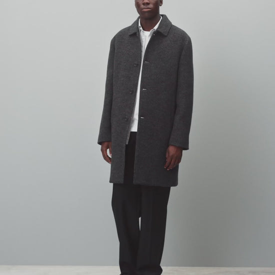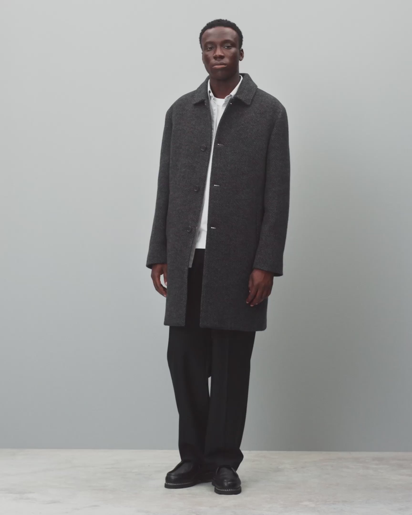 This single-breasted overcoat is crafted from a robust Italian herringbone wool, with a touch of cashmere for a softer feel. Featuring a generous standard fit for versatile layering, with cupro-lined sleeves and body, and a hem that falls right above the knee. Designed with a soft pointed collar, faux horn button closure, split welt pockets, an interior chest pocket, and a single rear vent.